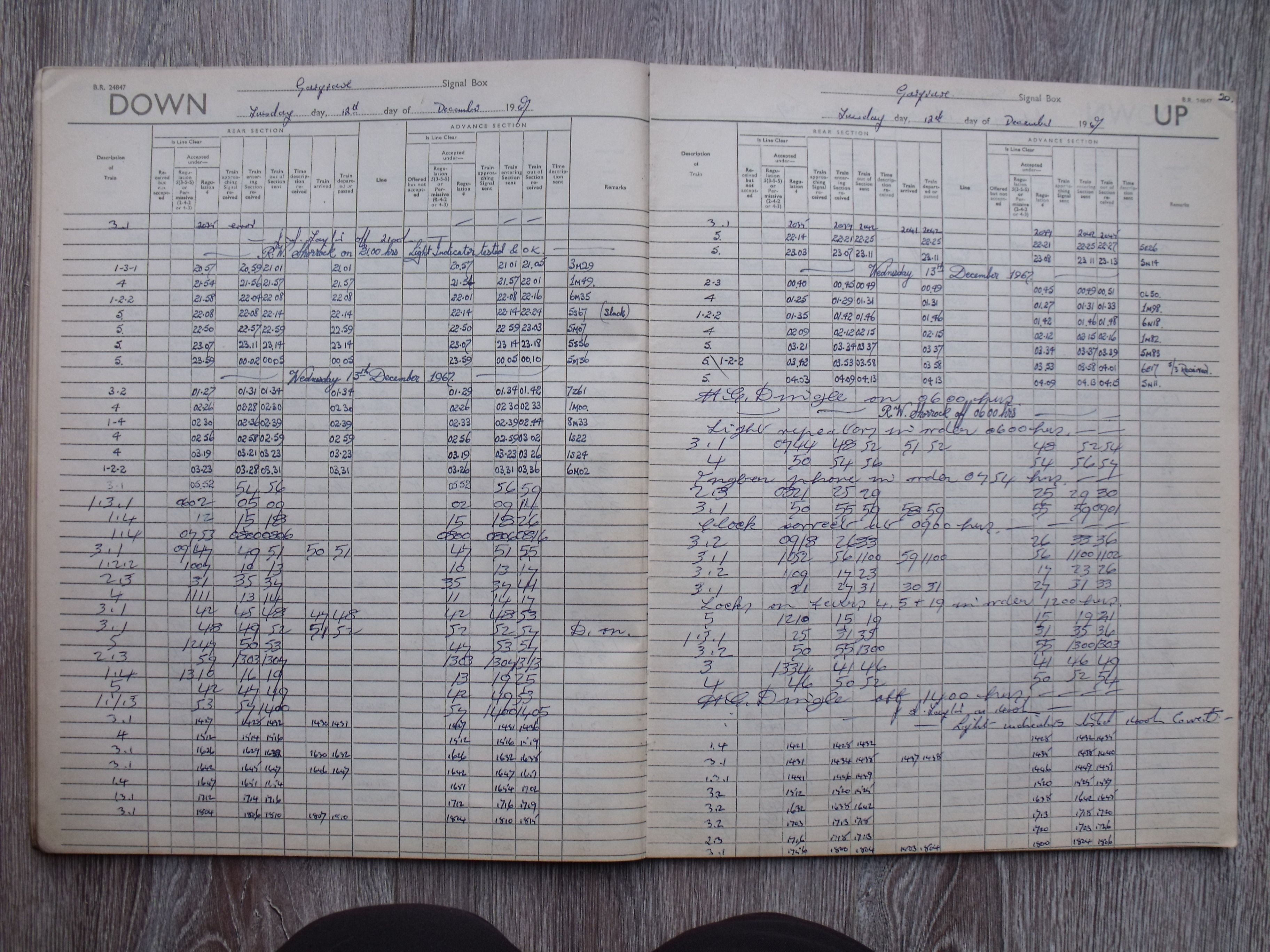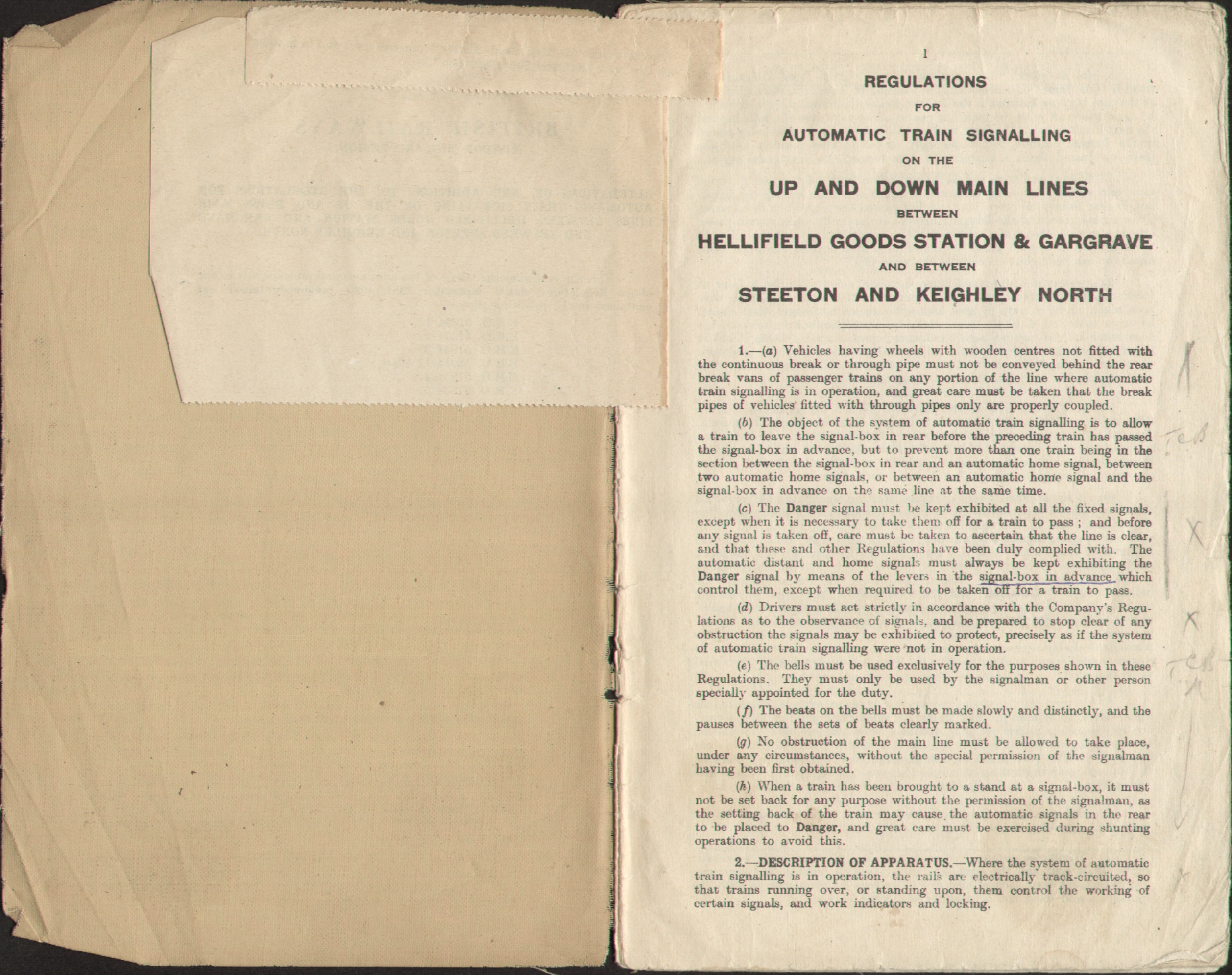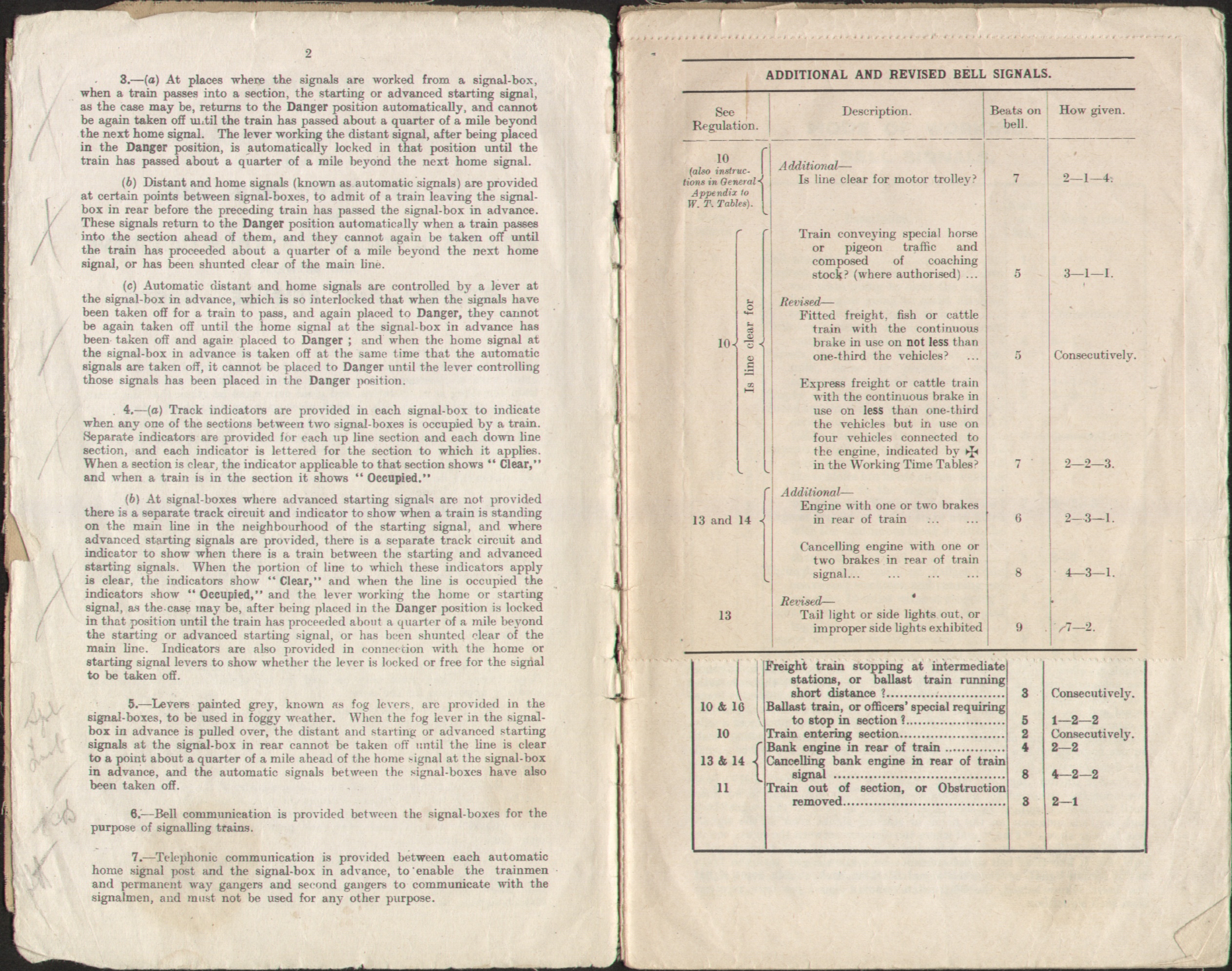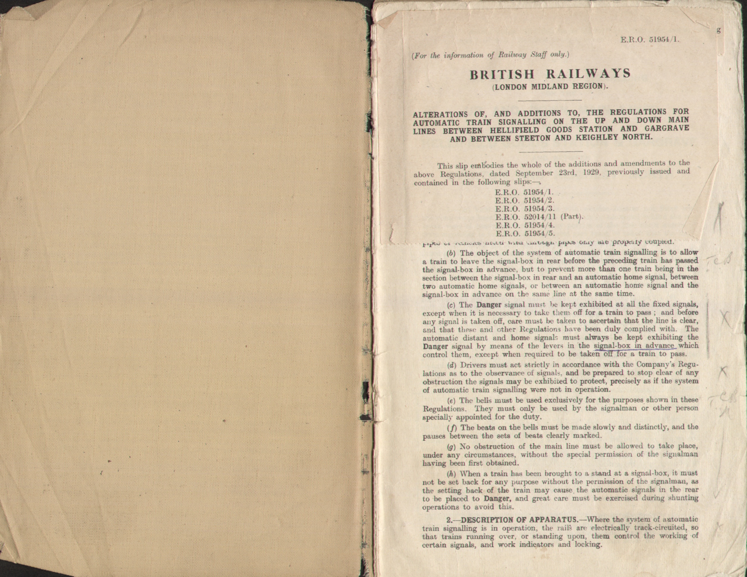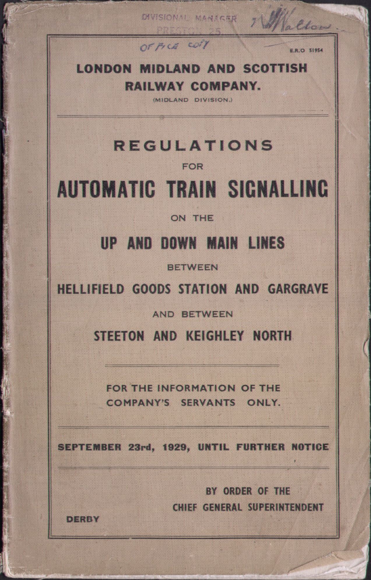 The LMS installed an early form of automatic signalling between Hellifield South Junction and Gargrave, and between Steeton and Keighley North. Shown here are a set of regulations for these sections of line, dated 1929 (was this the date of installation?), and also part of a train register from Gargrave. Although the signals were automatic, it seems to have been a requirement to maintain them at danger between trains. This led to an accident at Hellifield in 1955, when an automatic signal cleared reading into a manually controlled section for which the signal had not been replaced - the accident report can be found on the Railways Archive site here here. The report placed the blame squarely on the signalman for not replacing the signals as per the rules, but from a modern perspective the requirement for the signalman to actively do something to maintain safety seems a design flaw. As explained in the report, the signal controls were modified immediately after the accident.document with amendments title page page 1 pages 2-3 pages 4-5 pages 6-7 pages 8-9 page 10 bell signals 1950 orignal document page 1 (a) pages 1 (b) pages 2-3 pages 4-5 pages 4-5 pages 6-7 pages 8-9 (a) page 8-9 (b) Part of a Gargrave Train Register from 1967. Look carefully and you can see examples of down trains being offered and accepted before train out of section has been received for the previous train (e.g. image 13, 12:00 hrs). image 1 image 2 image 3 image 4 image 5 image 6 image 7 image 8 image 9 image 10 image 11 image 12 image 13 image 14 image 15 image 16 image 17 image 18 image 19 image 20 image 21 image 22 image 23 image 24 image 25 image 26 image 27