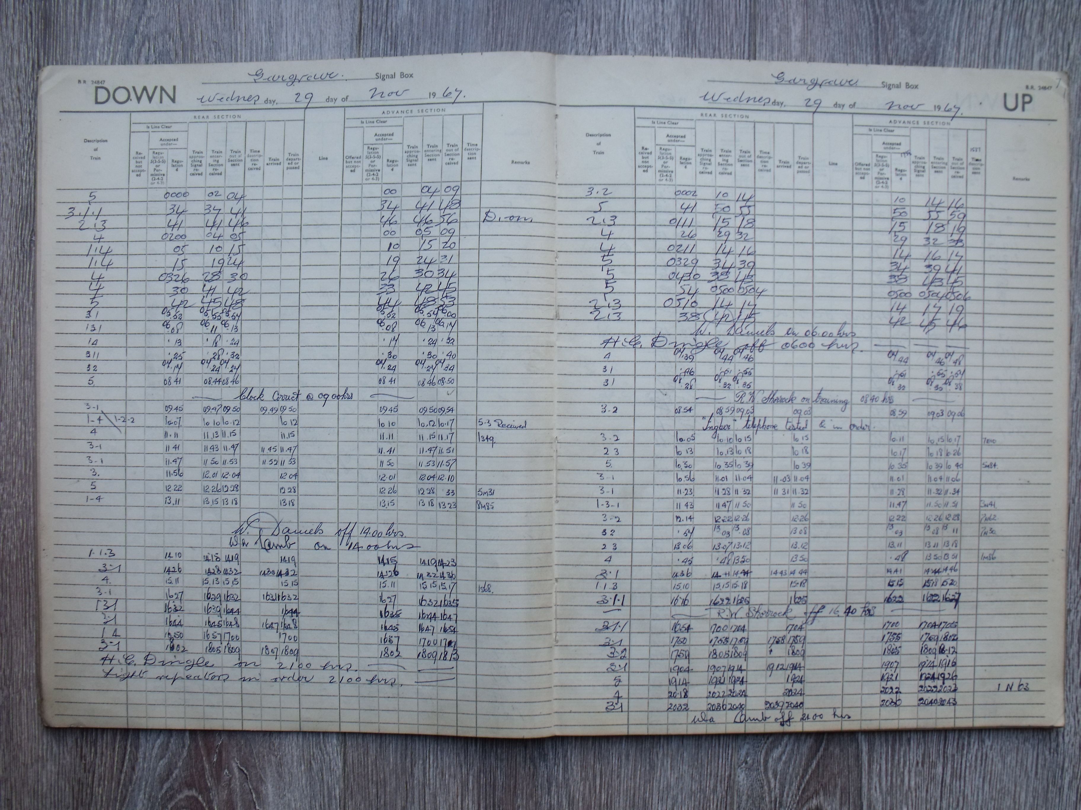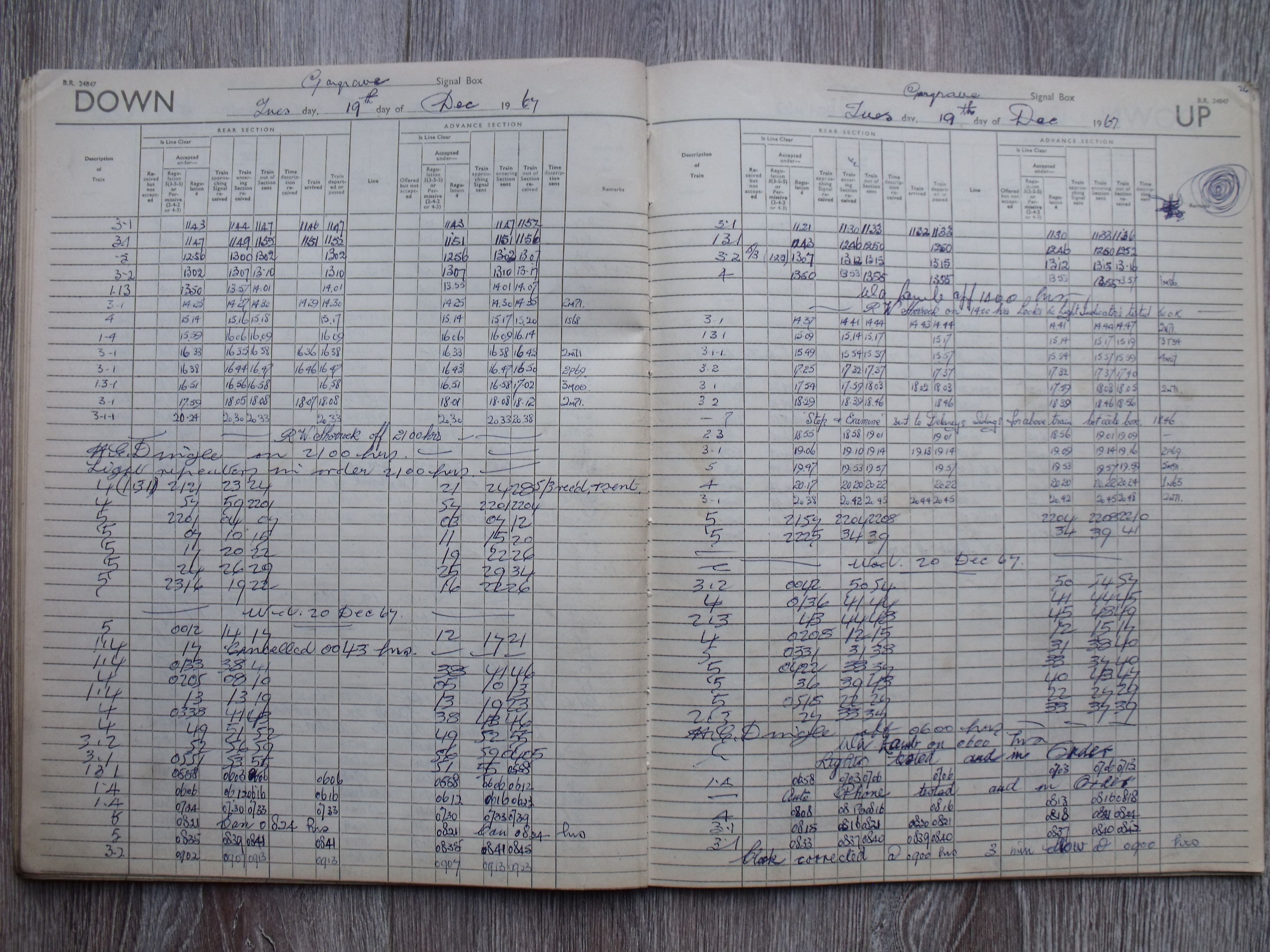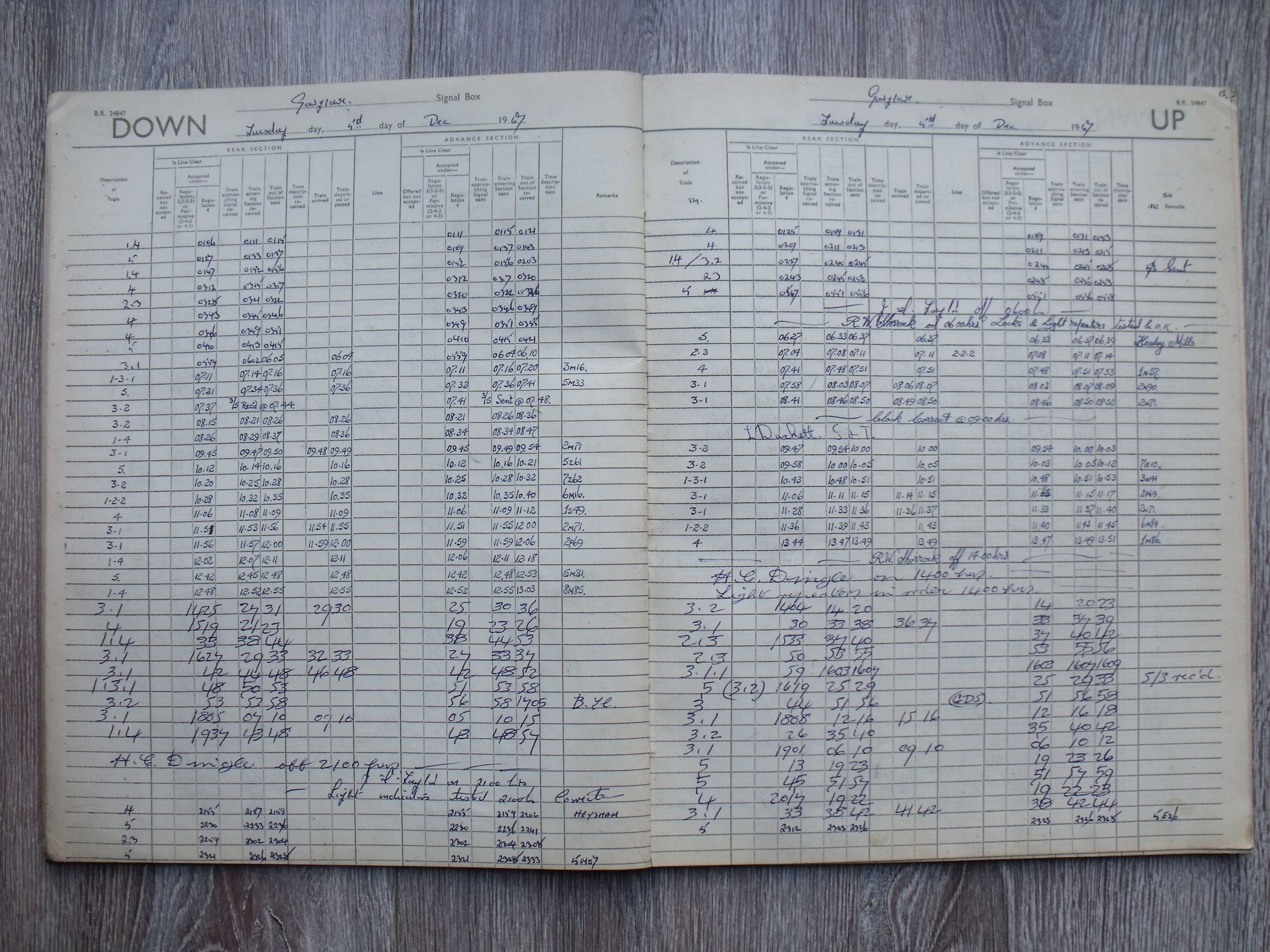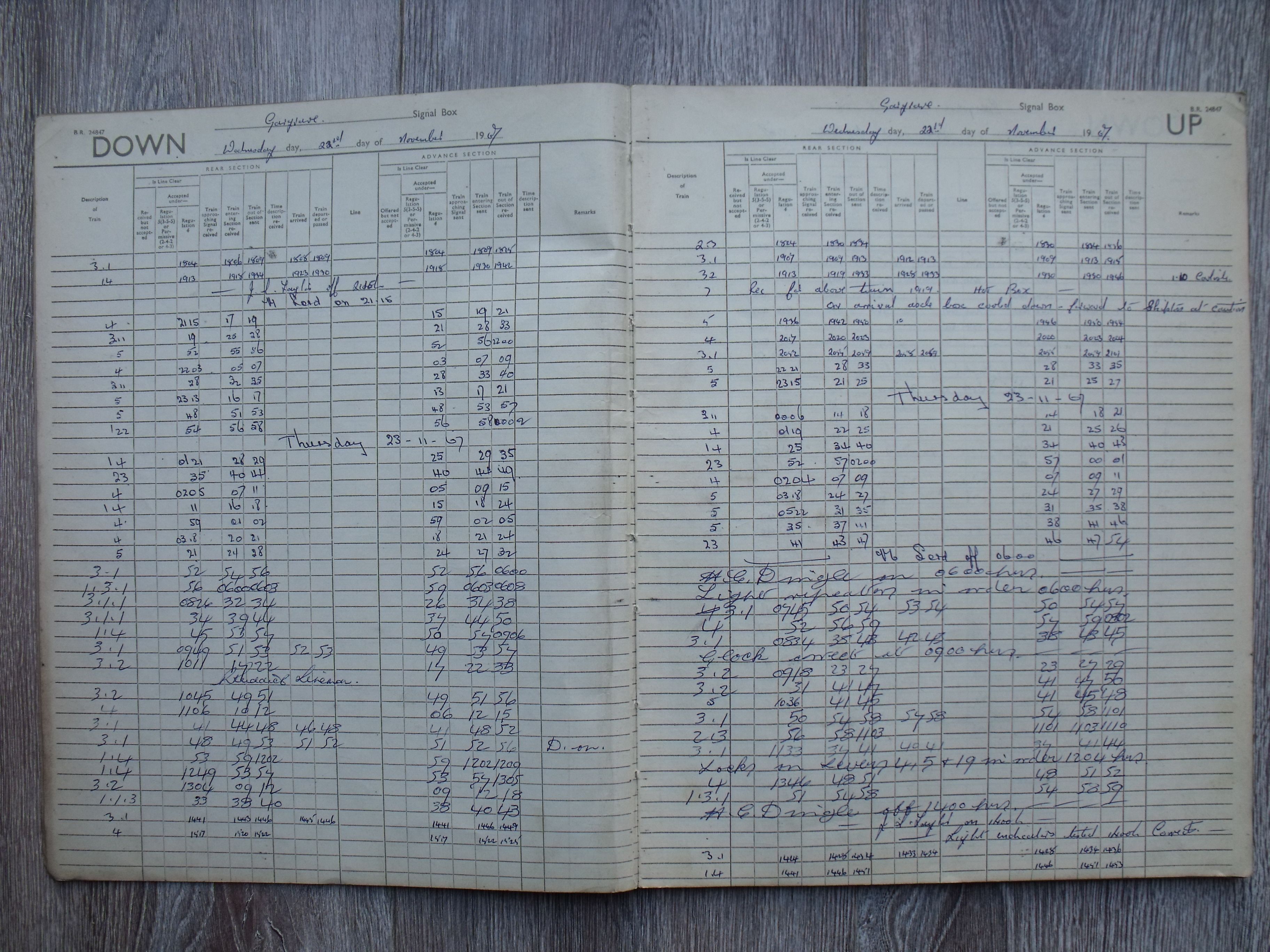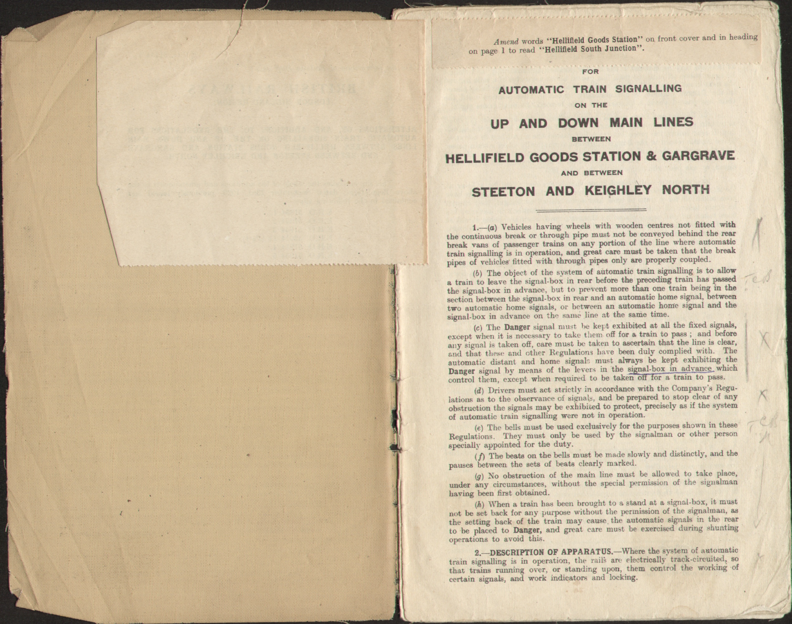 The LMS installed an early form of automatic signalling between Hellifield South Junction and Gargrave, and between Steeton and Keighley North. Shown here are a set of regulations for these sections of line, dated 1929 (was this the date of installation?), and also part of a train register from Gargrave. Although the signals were automatic, it seems to have been a requirement to maintain them at danger between trains. This led to an accident at Hellifield in 1955, when an automatic signal cleared reading into a manually controlled section for which the signal had not been replaced - the accident report can be found on the Railways Archive site here here. The report placed the blame squarely on the signalman for not replacing the signals as per the rules, but from a modern perspective the requirement for the signalman to actively do something to maintain safety seems a design flaw. As explained in the report, the signal controls were modified immediately after the accident.document with amendments title page page 1 pages 2-3 pages 4-5 pages 6-7 pages 8-9 page 10 bell signals 1950 orignal document page 1 (a) pages 1 (b) pages 2-3 pages 4-5 pages 4-5 pages 6-7 pages 8-9 (a) page 8-9 (b) Part of a Gargrave Train Register from 1967. Look carefully and you can see examples of down trains being offered and accepted before train out of section has been received for the previous train (e.g. image 13, 12:00 hrs). image 1 image 2 image 3 image 4 image 5 image 6 image 7 image 8 image 9 image 10 image 11 image 12 image 13 image 14 image 15 image 16 image 17 image 18 image 19 image 20 image 21 image 22 image 23 image 24 image 25 image 26 image 27
