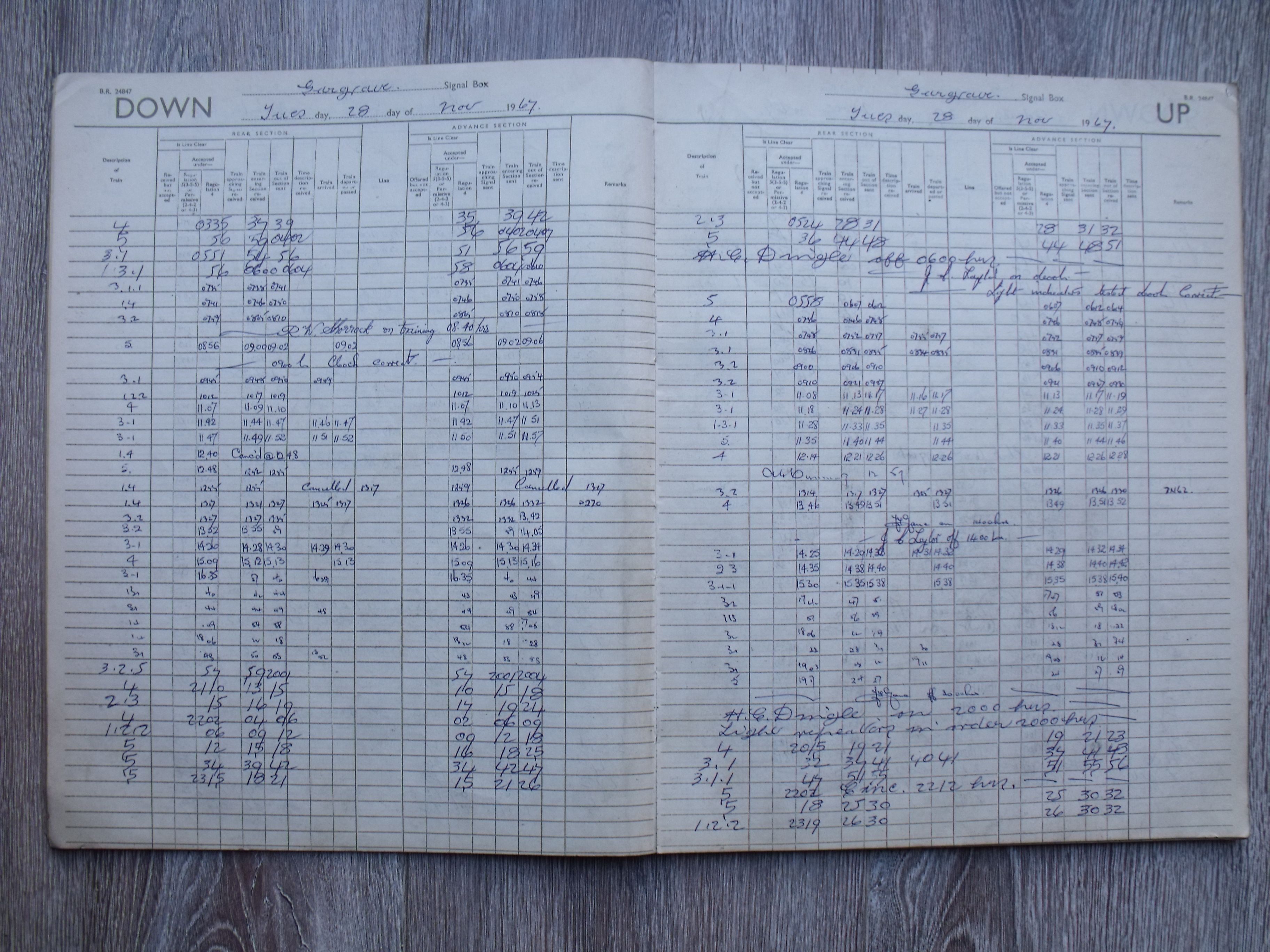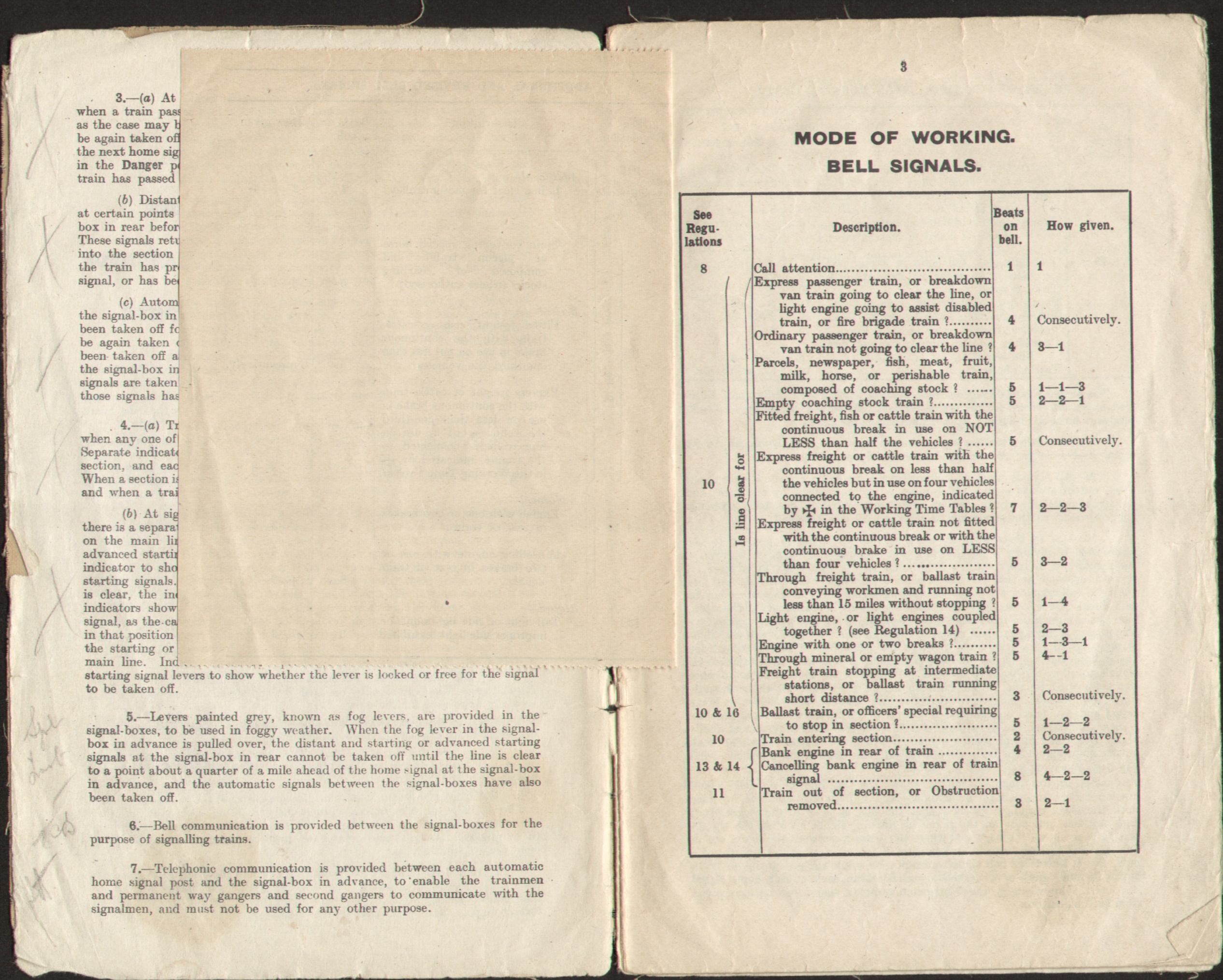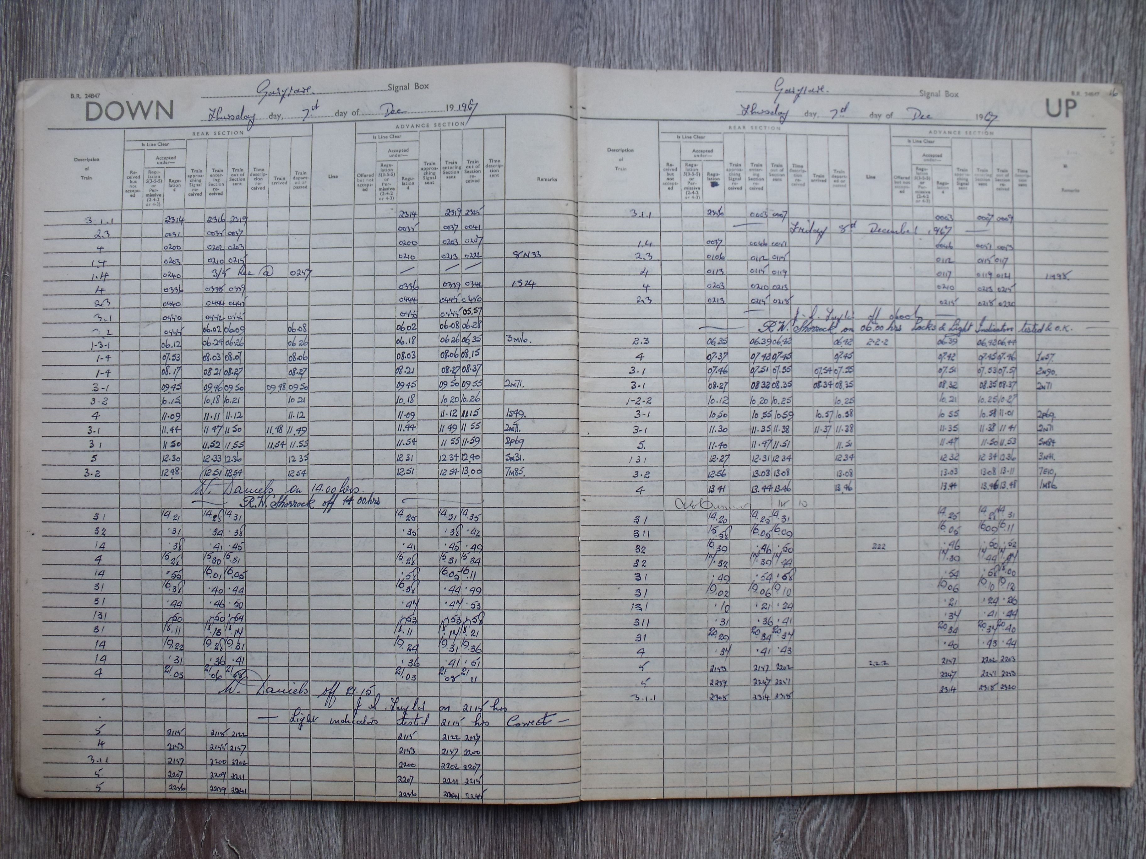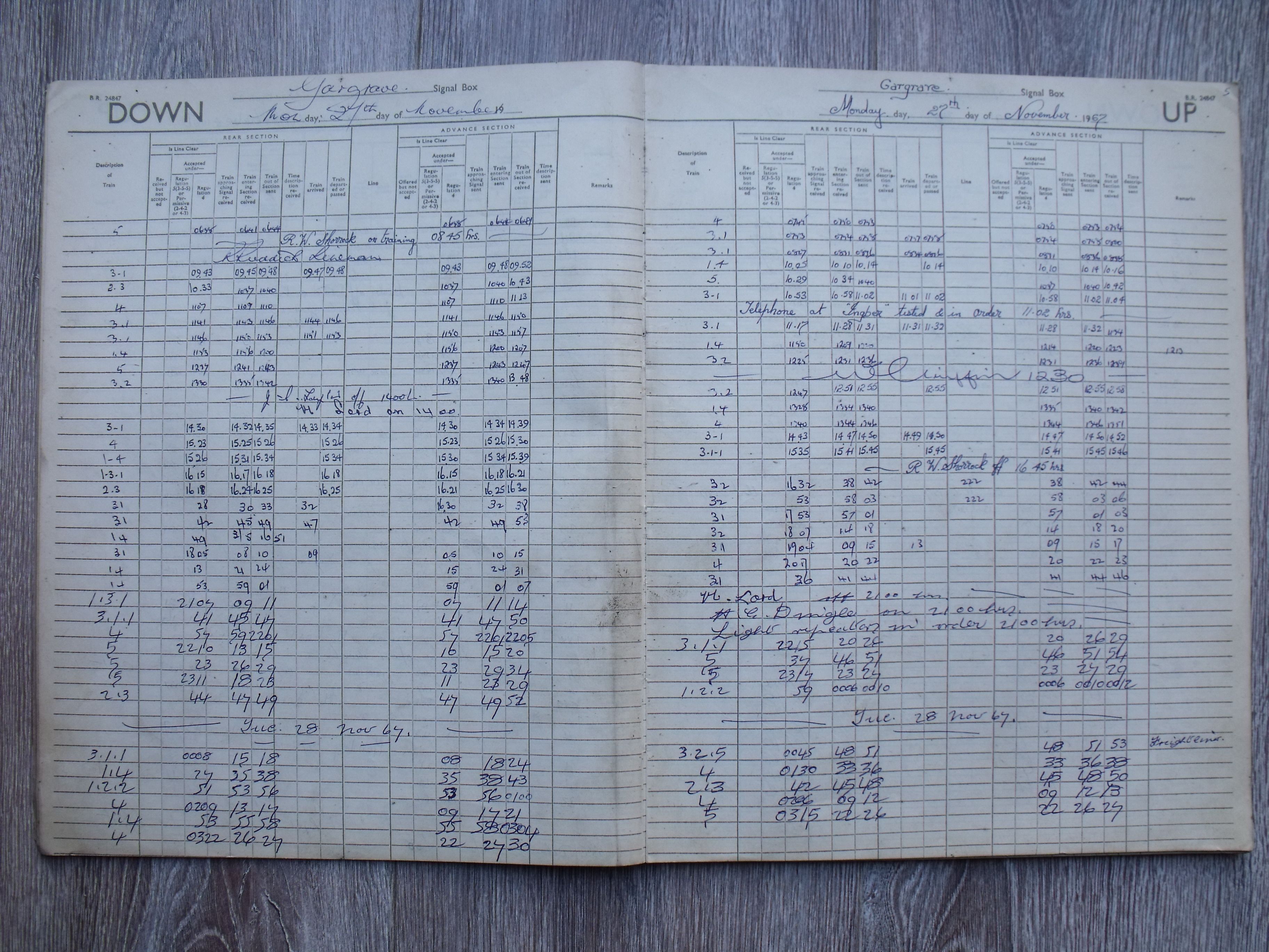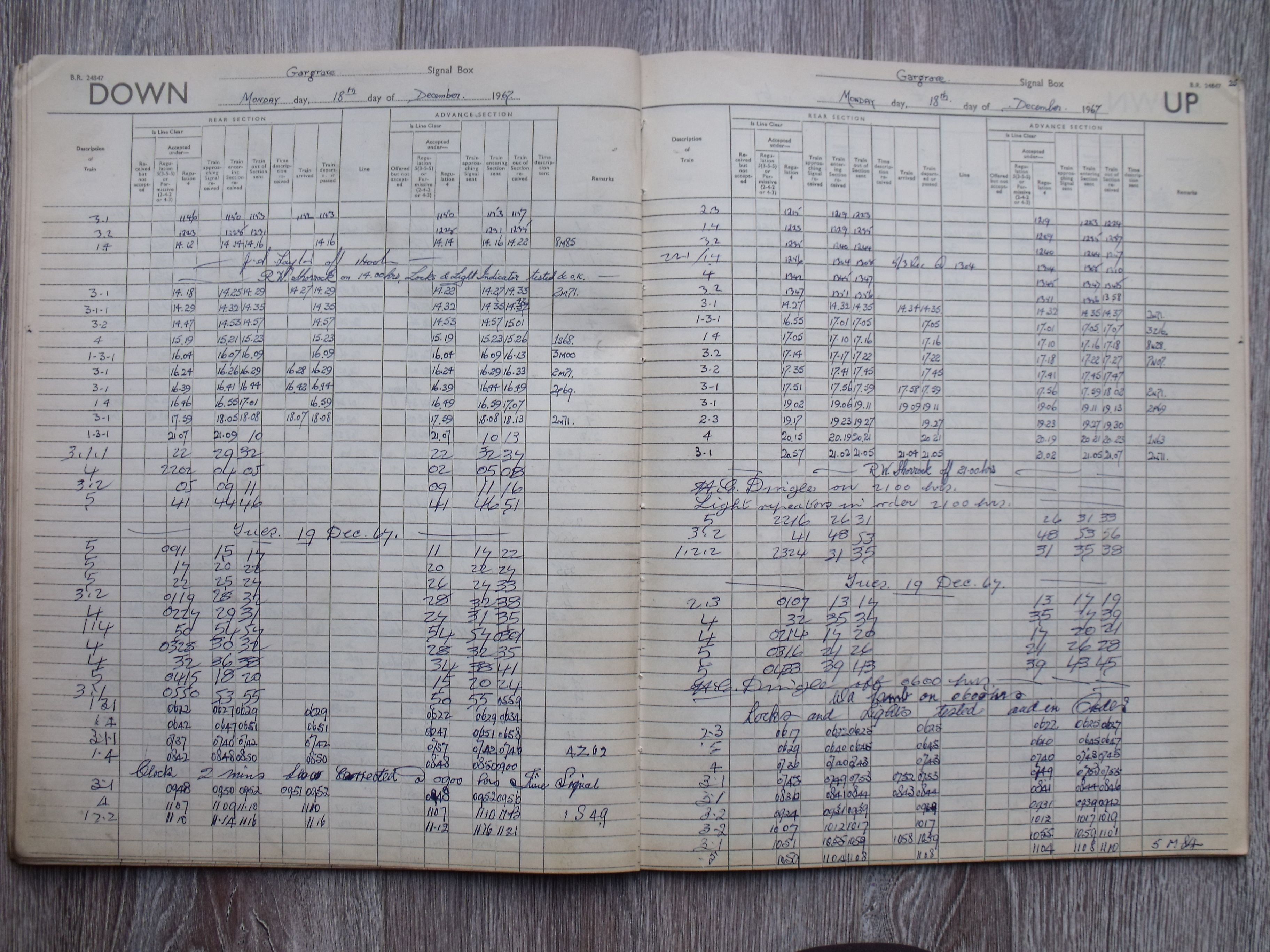 The LMS installed an early form of automatic signalling between Hellifield South Junction and Gargrave, and between Steeton and Keighley North. Shown here are a set of regulations for these sections of line, dated 1929 (was this the date of installation?), and also part of a train register from Gargrave. Although the signals were automatic, it seems to have been a requirement to maintain them at danger between trains. This led to an accident at Hellifield in 1955, when an automatic signal cleared reading into a manually controlled section for which the signal had not been replaced - the accident report can be found on the Railways Archive site here here. The report placed the blame squarely on the signalman for not replacing the signals as per the rules, but from a modern perspective the requirement for the signalman to actively do something to maintain safety seems a design flaw. As explained in the report, the signal controls were modified immediately after the accident.document with amendments title page page 1 pages 2-3 pages 4-5 pages 6-7 pages 8-9 page 10 bell signals 1950 orignal document page 1 (a) pages 1 (b) pages 2-3 pages 4-5 pages 4-5 pages 6-7 pages 8-9 (a) page 8-9 (b) Part of a Gargrave Train Register from 1967. Look carefully and you can see examples of down trains being offered and accepted before train out of section has been received for the previous train (e.g. image 13, 12:00 hrs). image 1 image 2 image 3 image 4 image 5 image 6 image 7 image 8 image 9 image 10 image 11 image 12 image 13 image 14 image 15 image 16 image 17 image 18 image 19 image 20 image 21 image 22 image 23 image 24 image 25 image 26 image 27