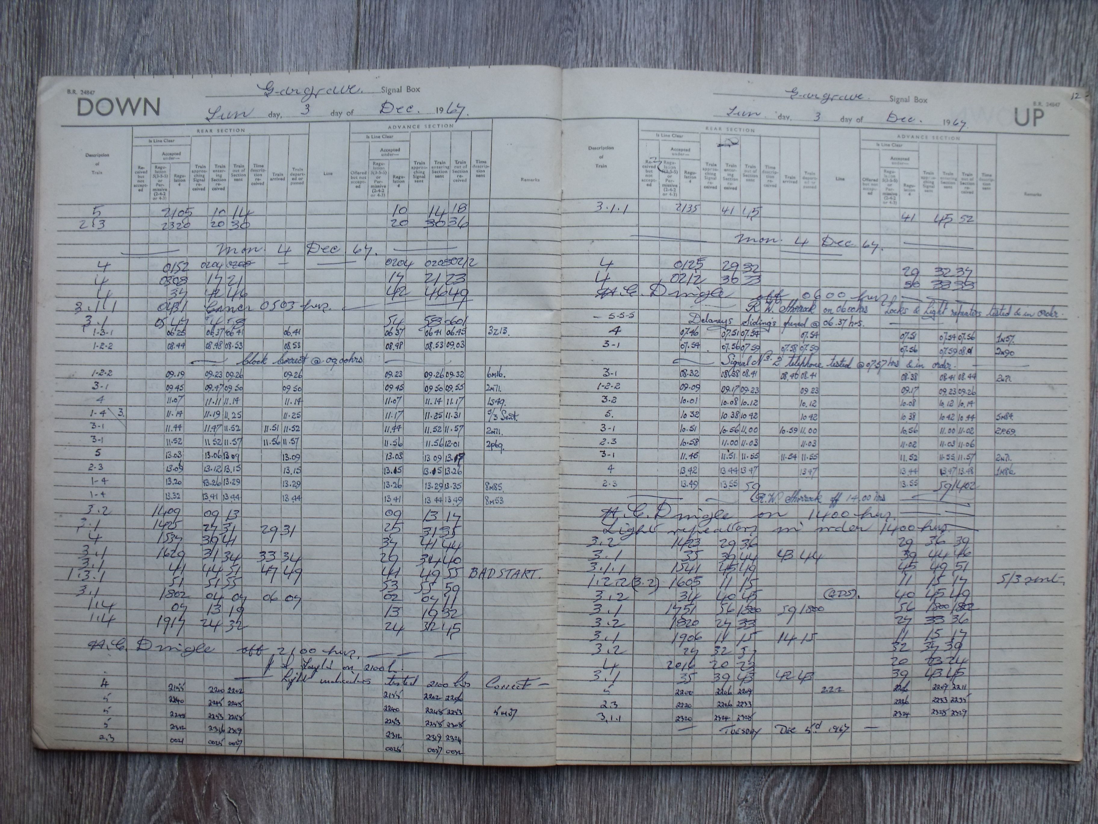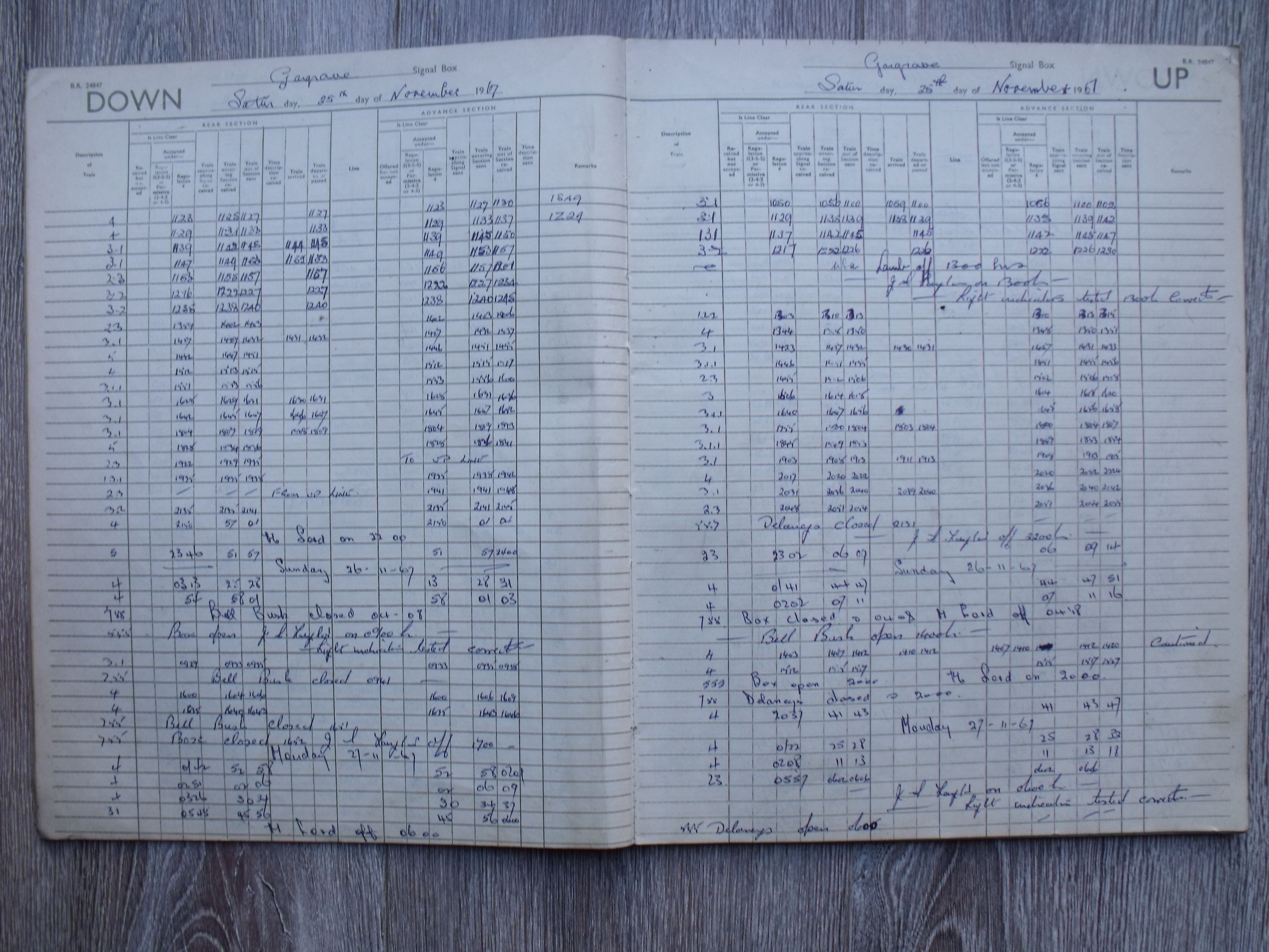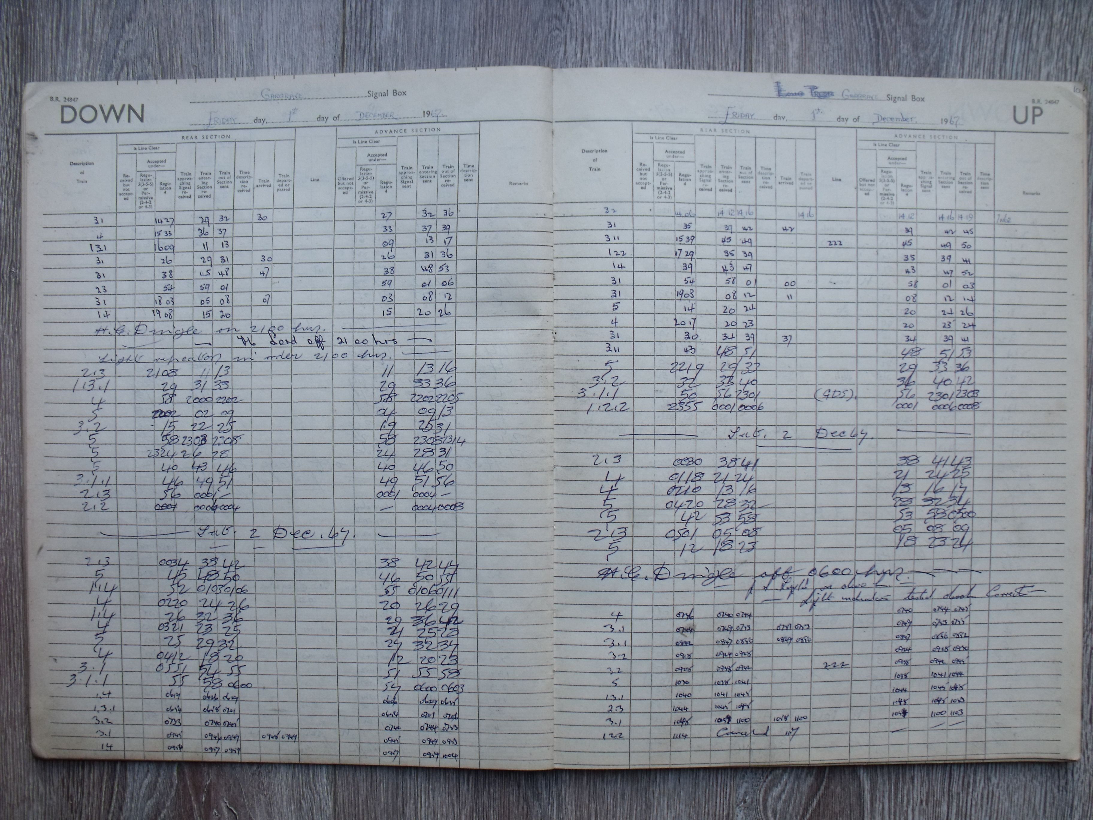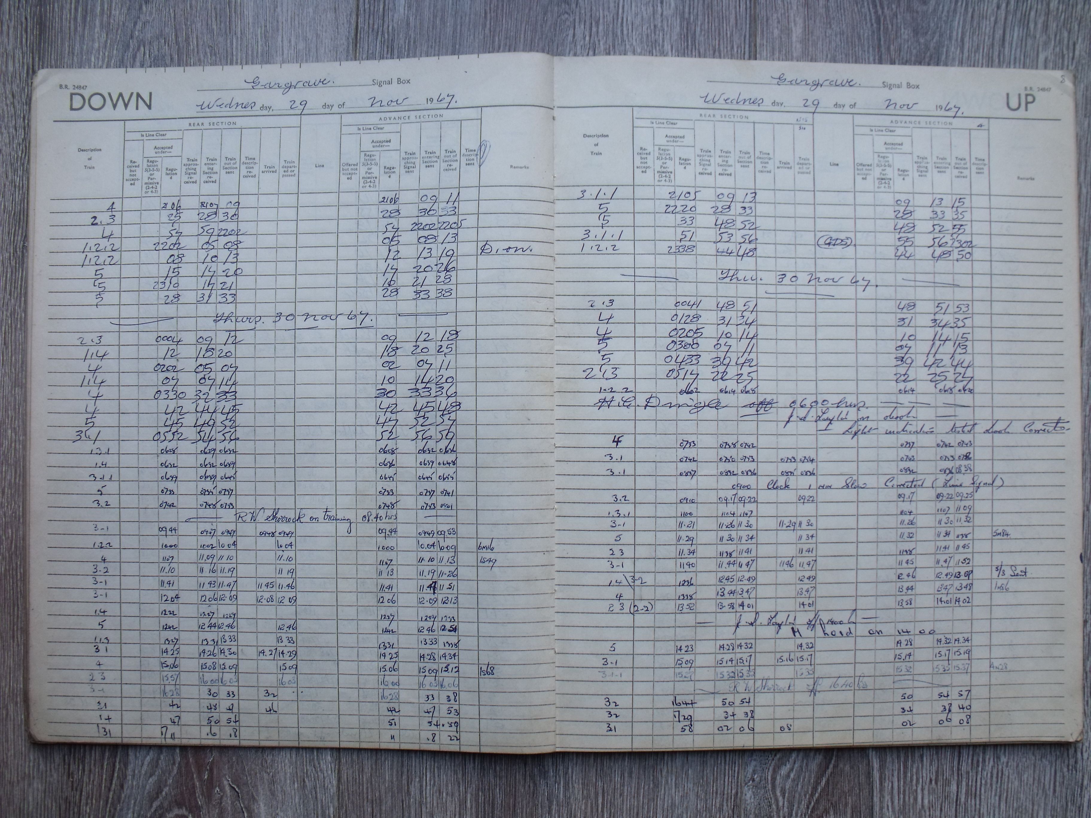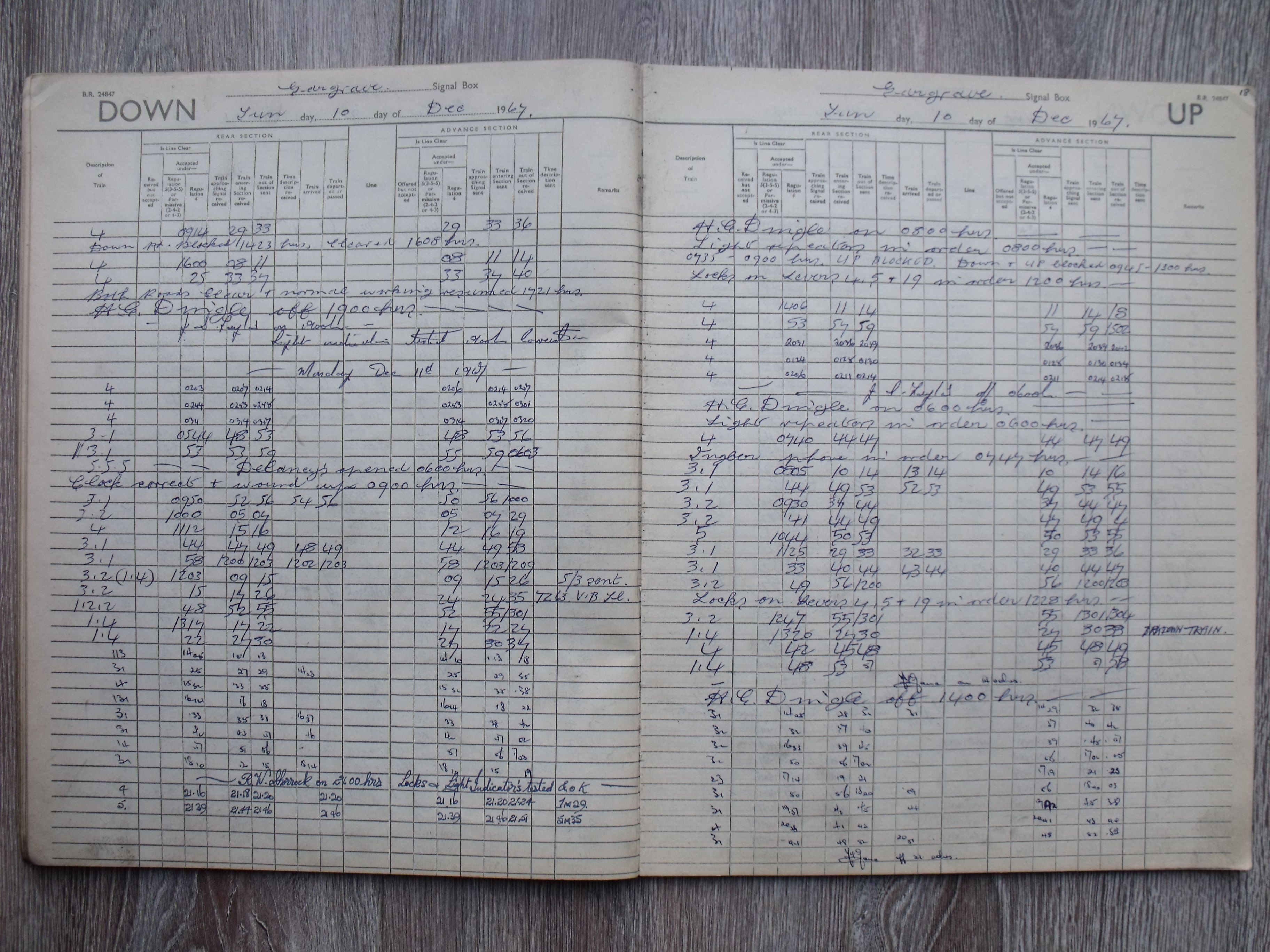 The LMS installed an early form of automatic signalling between Hellifield South Junction and Gargrave, and between Steeton and Keighley North. Shown here are a set of regulations for these sections of line, dated 1929 (was this the date of installation?), and also part of a train register from Gargrave. Although the signals were automatic, it seems to have been a requirement to maintain them at danger between trains. This led to an accident at Hellifield in 1955, when an automatic signal cleared reading into a manually controlled section for which the signal had not been replaced - the accident report can be found on the Railways Archive site here here. The report placed the blame squarely on the signalman for not replacing the signals as per the rules, but from a modern perspective the requirement for the signalman to actively do something to maintain safety seems a design flaw. As explained in the report, the signal controls were modified immediately after the accident.document with amendments title page page 1 pages 2-3 pages 4-5 pages 6-7 pages 8-9 page 10 bell signals 1950 orignal document page 1 (a) pages 1 (b) pages 2-3 pages 4-5 pages 4-5 pages 6-7 pages 8-9 (a) page 8-9 (b) Part of a Gargrave Train Register from 1967. Look carefully and you can see examples of down trains being offered and accepted before train out of section has been received for the previous train (e.g. image 13, 12:00 hrs). image 1 image 2 image 3 image 4 image 5 image 6 image 7 image 8 image 9 image 10 image 11 image 12 image 13 image 14 image 15 image 16 image 17 image 18 image 19 image 20 image 21 image 22 image 23 image 24 image 25 image 26 image 27