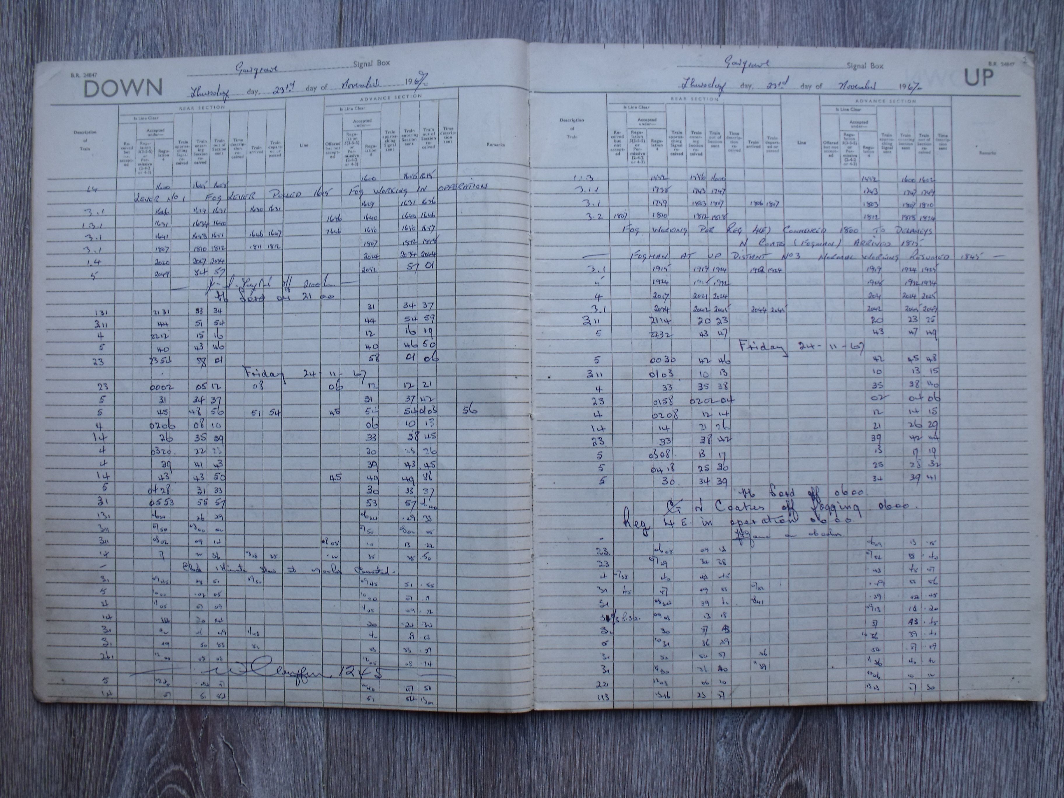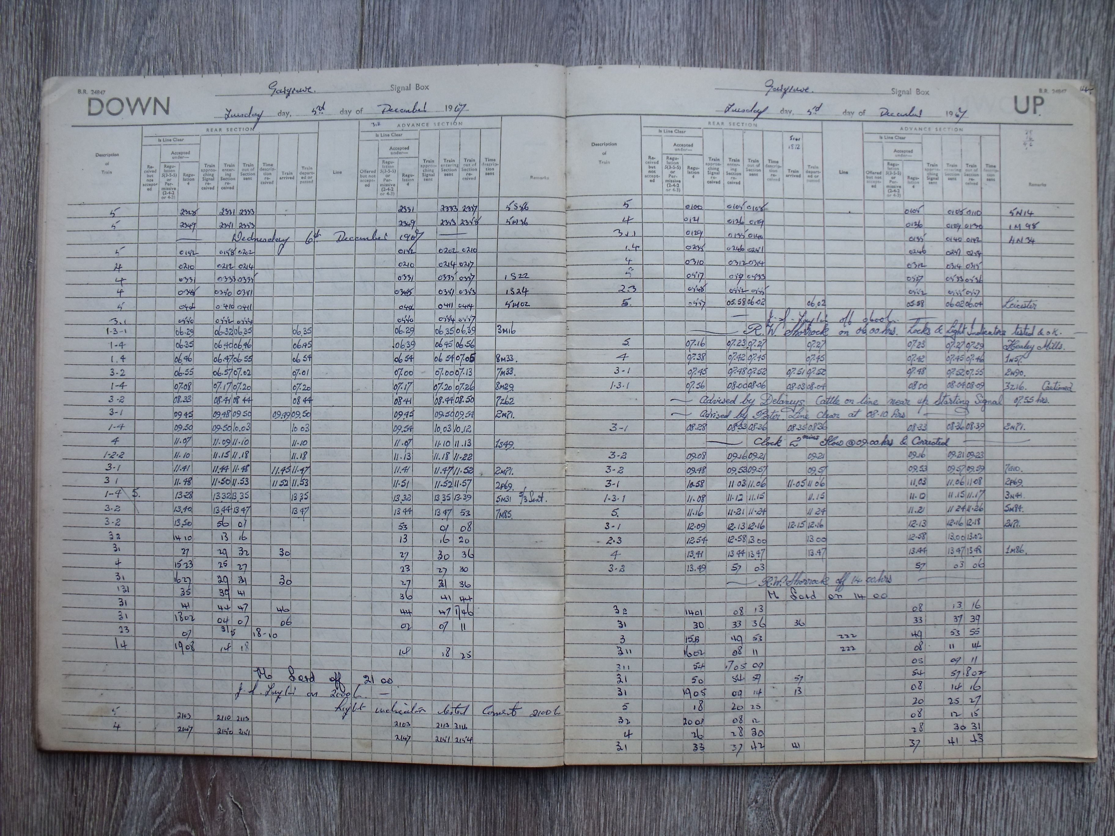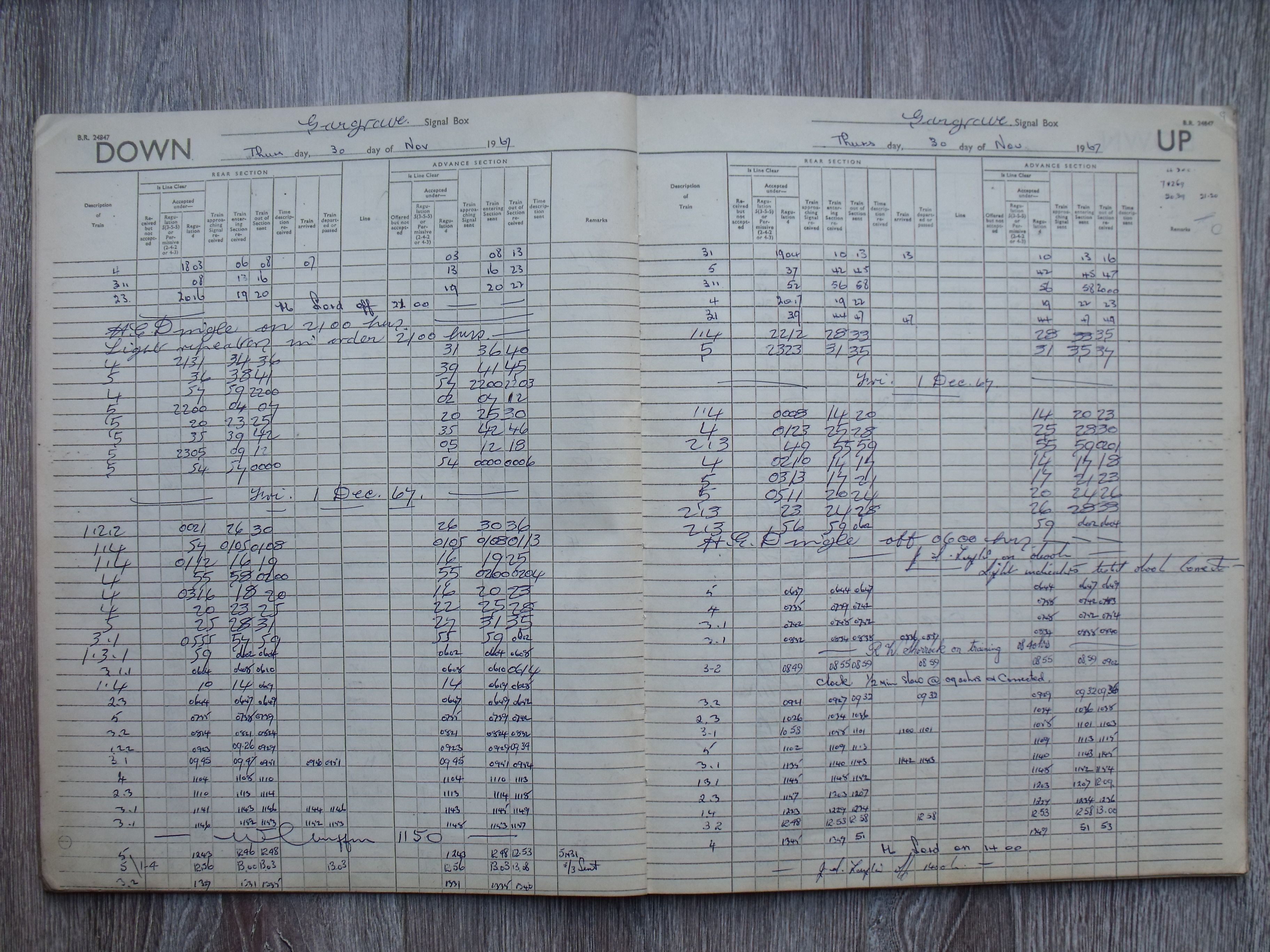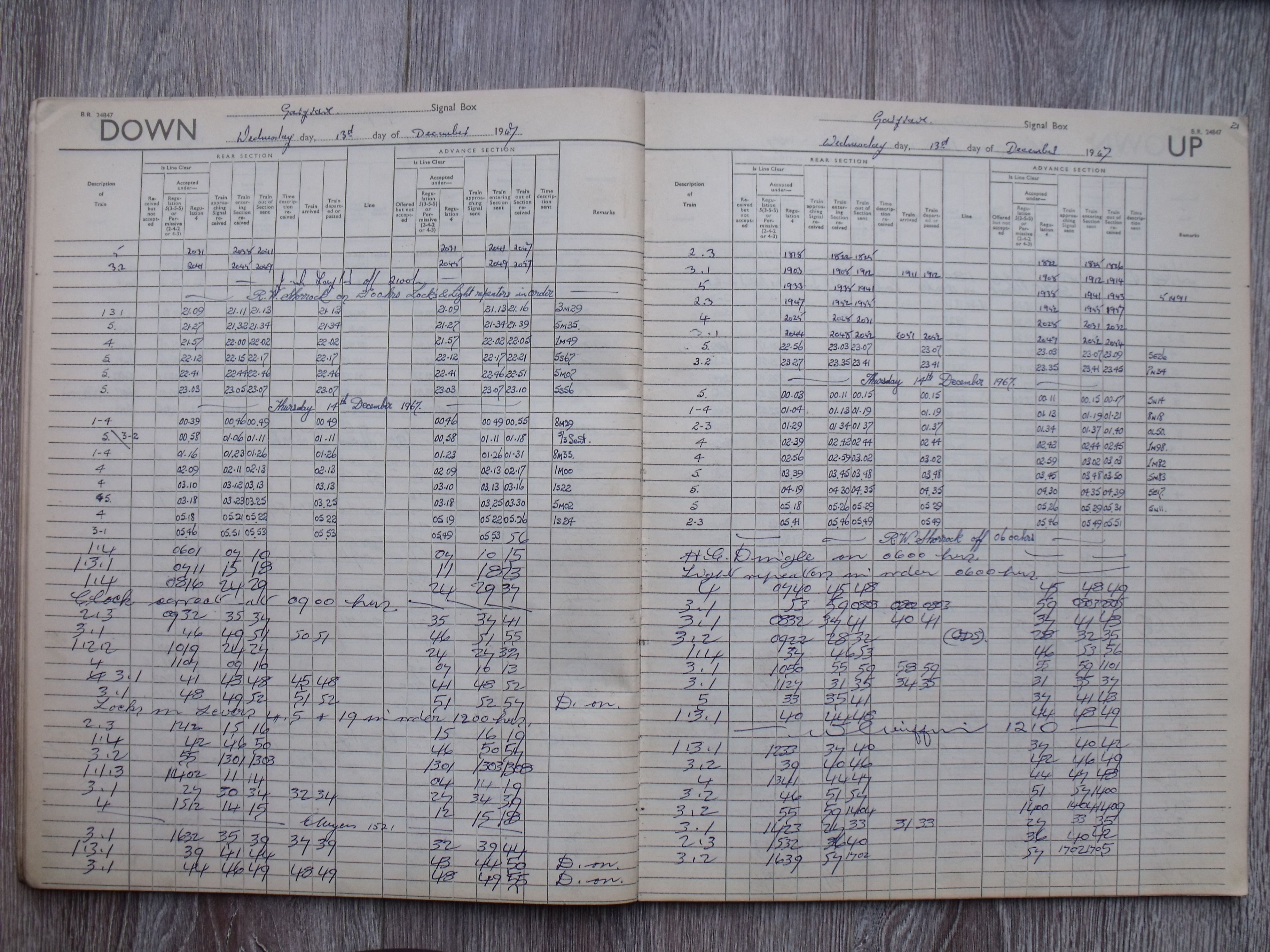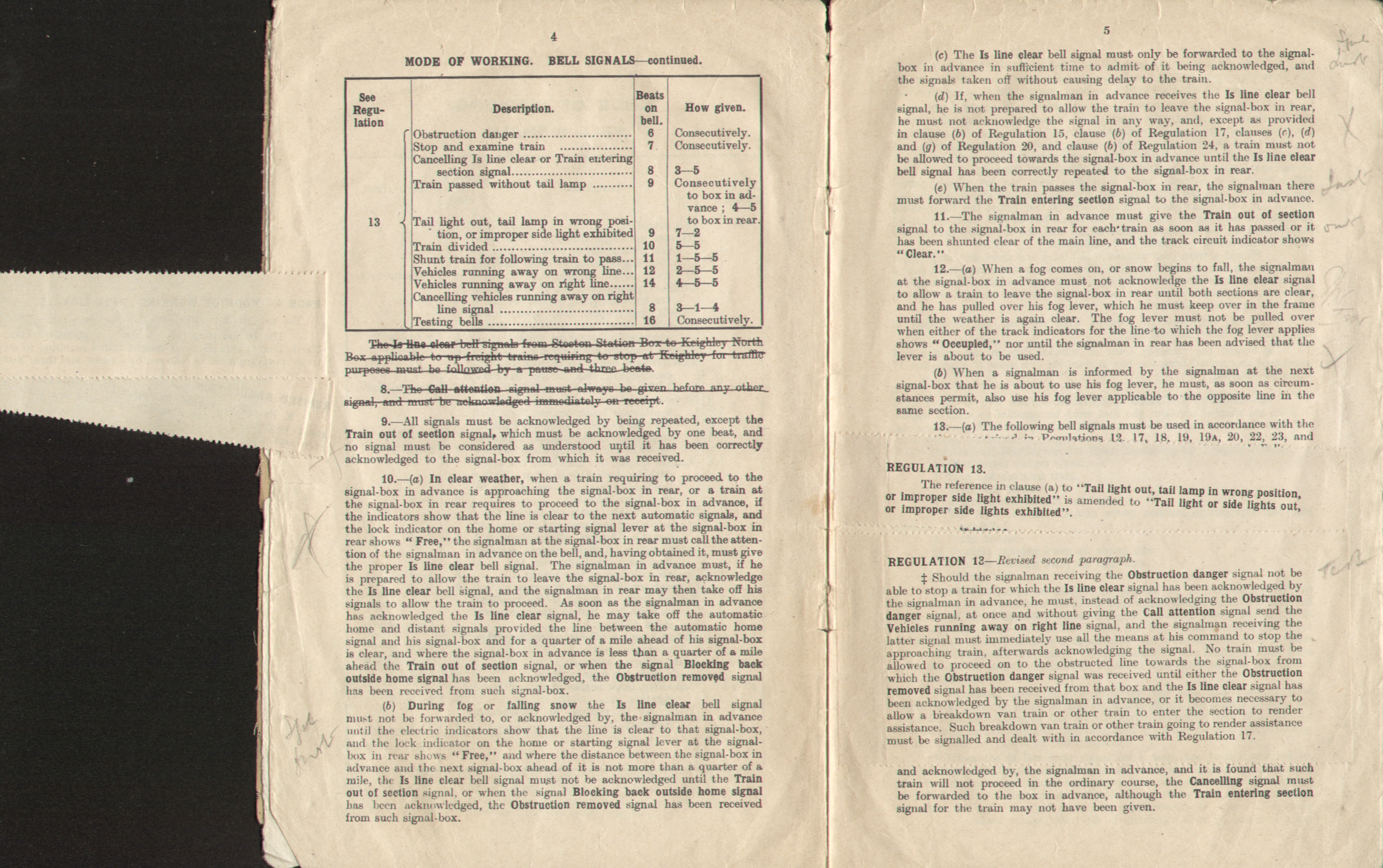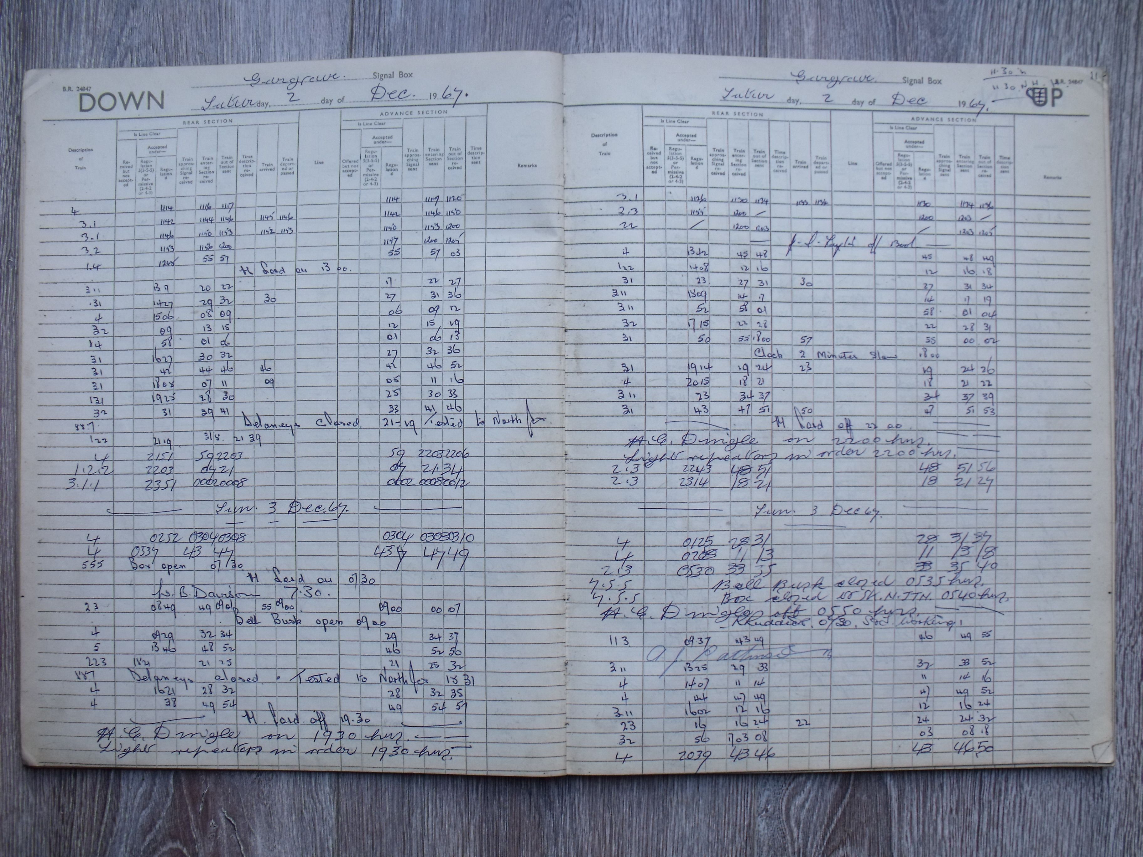The LMS installed an early form of automatic signalling between Hellifield South Junction and Gargrave, and between Steeton and Keighley North. Shown here are a set of regulations for these sections of line, dated 1929 (was this the date of installation?), and also part of a train register from Gargrave. Although the signals were automatic, it seems to have been a requirement to maintain them at danger between trains. This led to an accident at Hellifield in 1955, when an automatic signal cleared reading into a manually controlled section for which the signal had not been replaced - the accident report can be found on the Railways Archive site here here. The report placed the blame squarely on the signalman for not replacing the signals as per the rules, but from a modern perspective the requirement for the signalman to actively do something to maintain safety seems a design flaw. As explained in the report, the signal controls were modified immediately after the accident.document with amendments title page page 1 pages 2-3 pages 4-5 pages 6-7 pages 8-9 page 10 bell signals 1950 orignal document page 1 (a) pages 1 (b) pages 2-3 pages 4-5 pages 4-5 pages 6-7 pages 8-9 (a) page 8-9 (b) Part of a Gargrave Train Register from 1967. Look carefully and you can see examples of down trains being offered and accepted before train out of section has been received for the previous train (e.g. image 13, 12:00 hrs). image 1 image 2 image 3 image 4 image 5 image 6 image 7 image 8 image 9 image 10 image 11 image 12 image 13 image 14 image 15 image 16 image 17 image 18 image 19 image 20 image 21 image 22 image 23 image 24 image 25 image 26 image 27