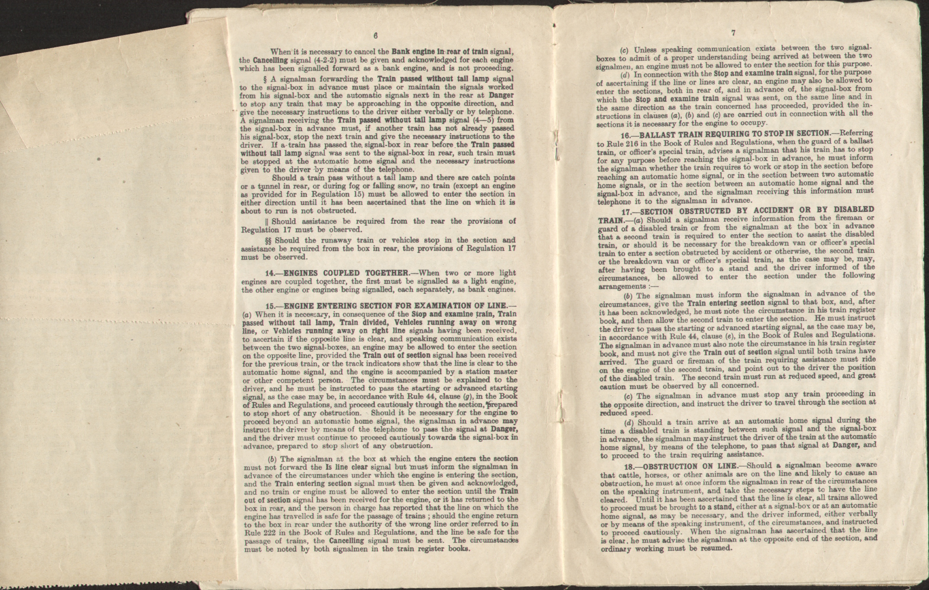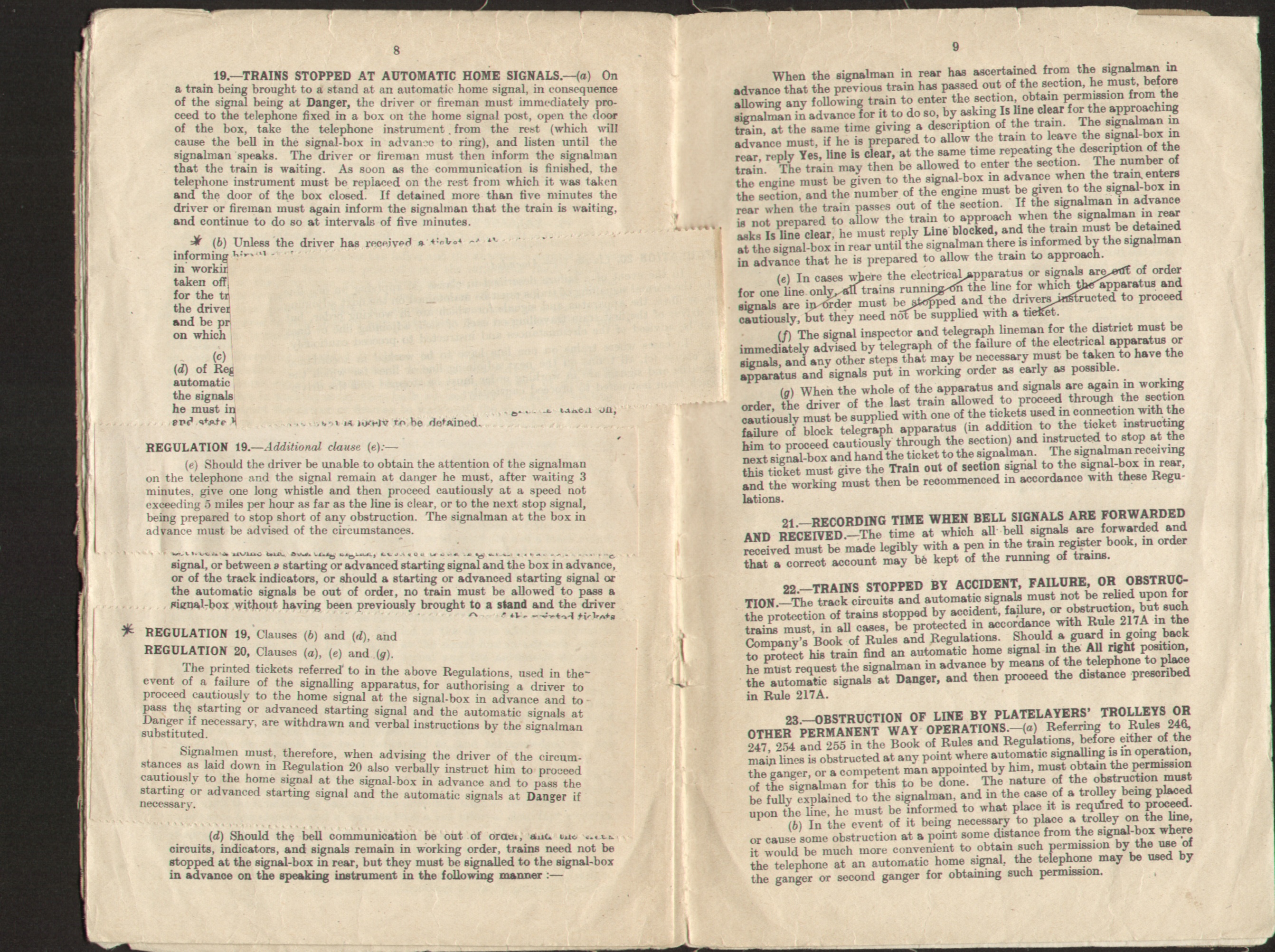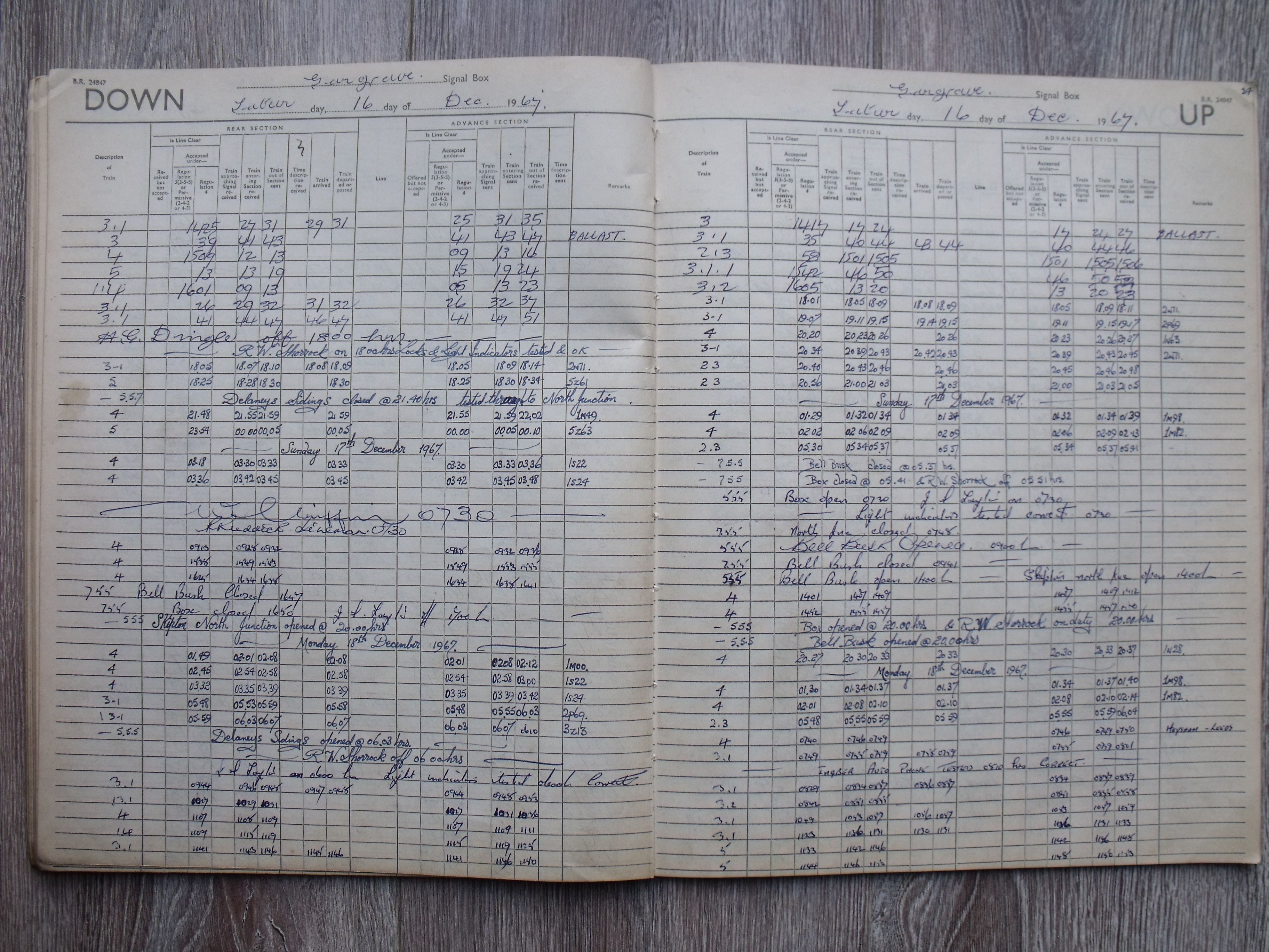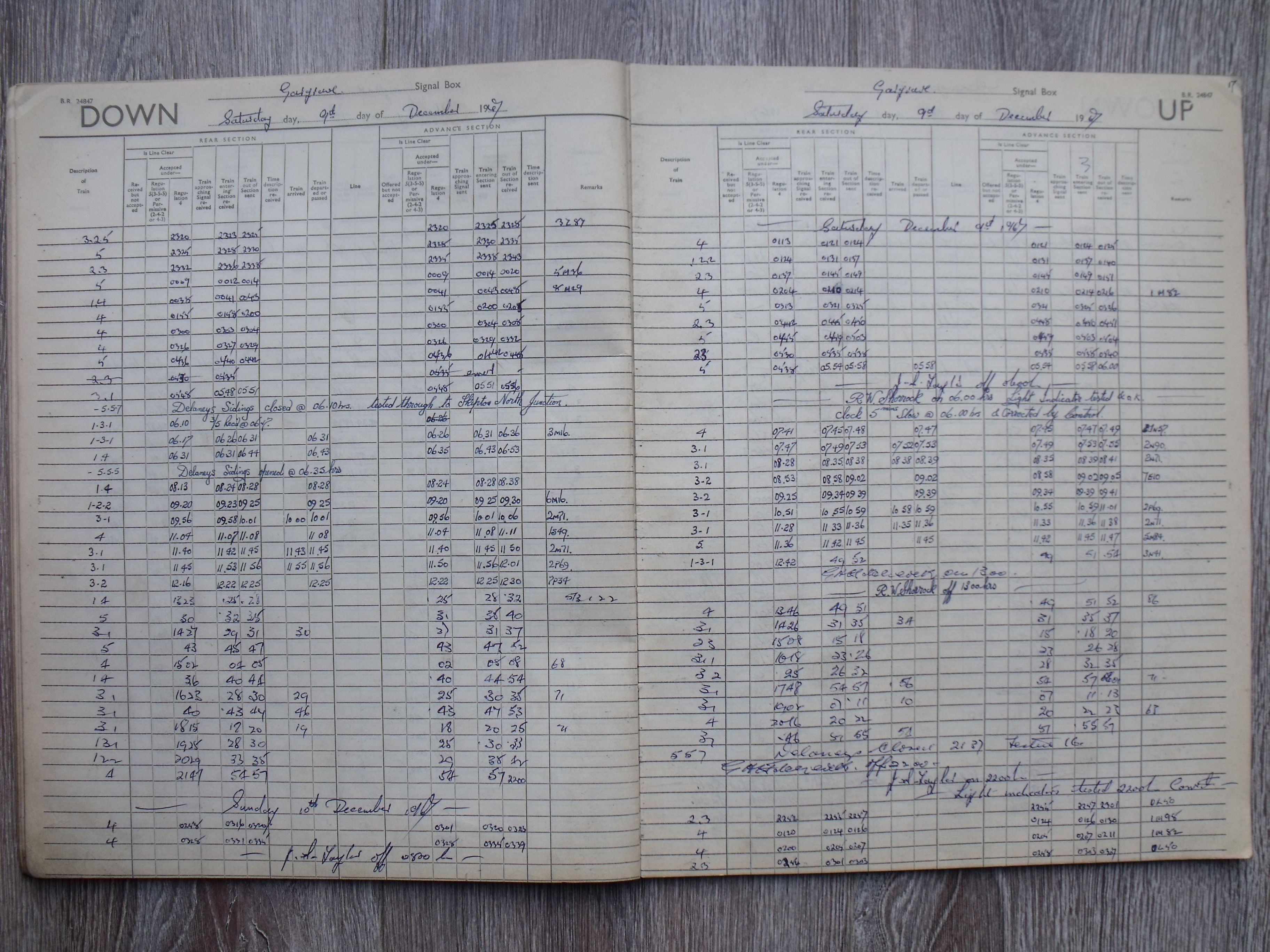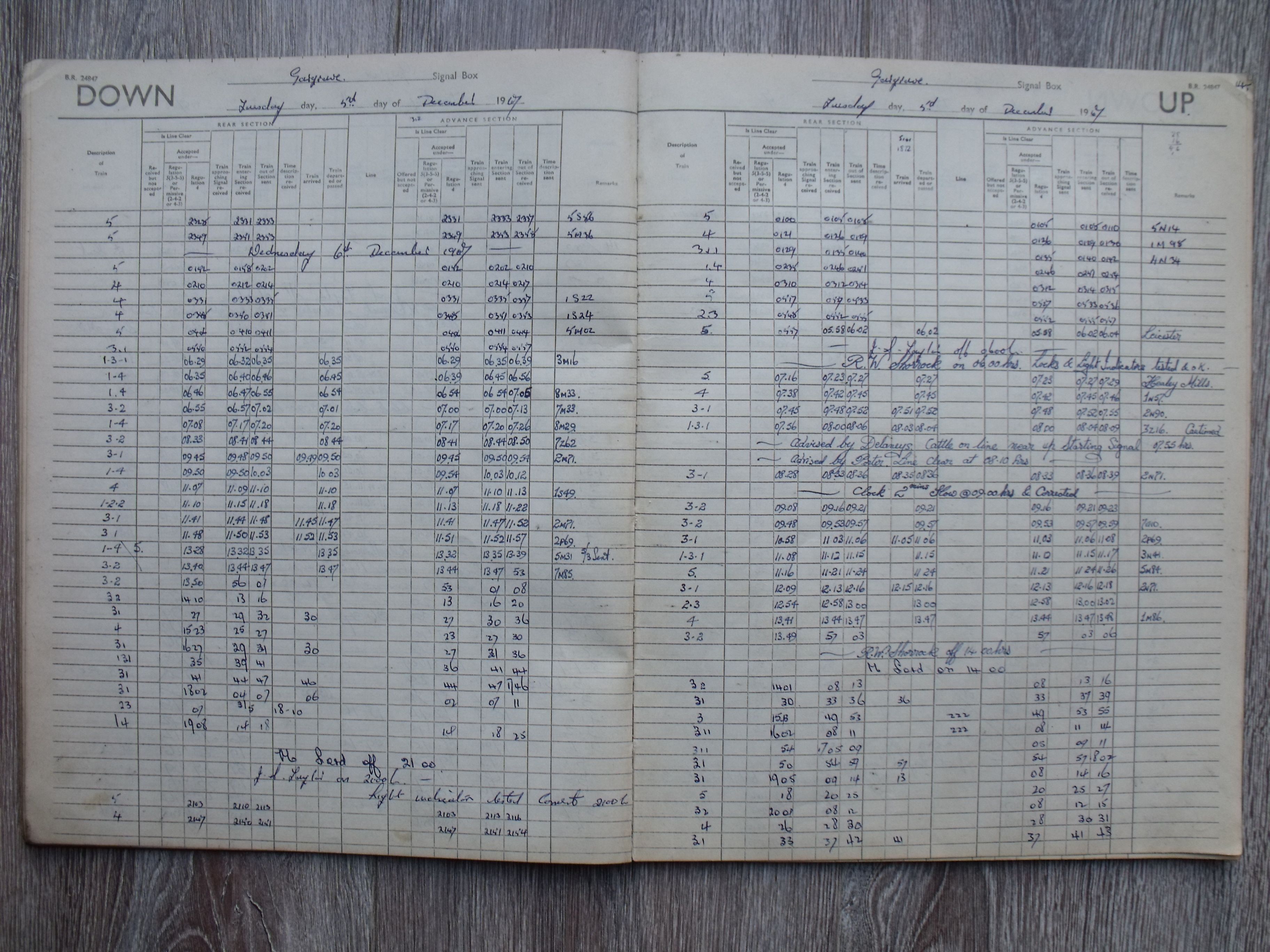 The LMS installed an early form of automatic signalling between Hellifield South Junction and Gargrave, and between Steeton and Keighley North. Shown here are a set of regulations for these sections of line, dated 1929 (was this the date of installation?), and also part of a train register from Gargrave. Although the signals were automatic, it seems to have been a requirement to maintain them at danger between trains. This led to an accident at Hellifield in 1955, when an automatic signal cleared reading into a manually controlled section for which the signal had not been replaced - the accident report can be found on the Railways Archive site here here. The report placed the blame squarely on the signalman for not replacing the signals as per the rules, but from a modern perspective the requirement for the signalman to actively do something to maintain safety seems a design flaw. As explained in the report, the signal controls were modified immediately after the accident.document with amendments title page page 1 pages 2-3 pages 4-5 pages 6-7 pages 8-9 page 10 bell signals 1950 orignal document page 1 (a) pages 1 (b) pages 2-3 pages 4-5 pages 4-5 pages 6-7 pages 8-9 (a) page 8-9 (b) Part of a Gargrave Train Register from 1967. Look carefully and you can see examples of down trains being offered and accepted before train out of section has been received for the previous train (e.g. image 13, 12:00 hrs). image 1 image 2 image 3 image 4 image 5 image 6 image 7 image 8 image 9 image 10 image 11 image 12 image 13 image 14 image 15 image 16 image 17 image 18 image 19 image 20 image 21 image 22 image 23 image 24 image 25 image 26 image 27