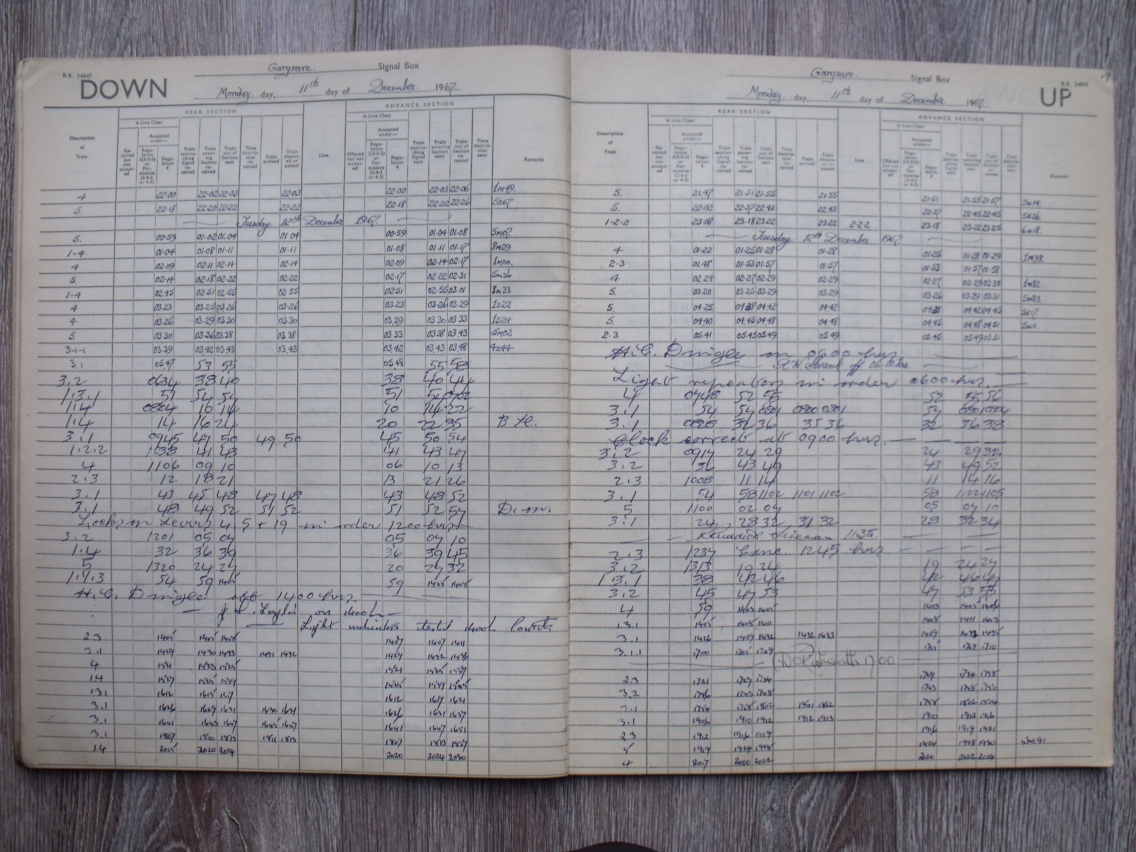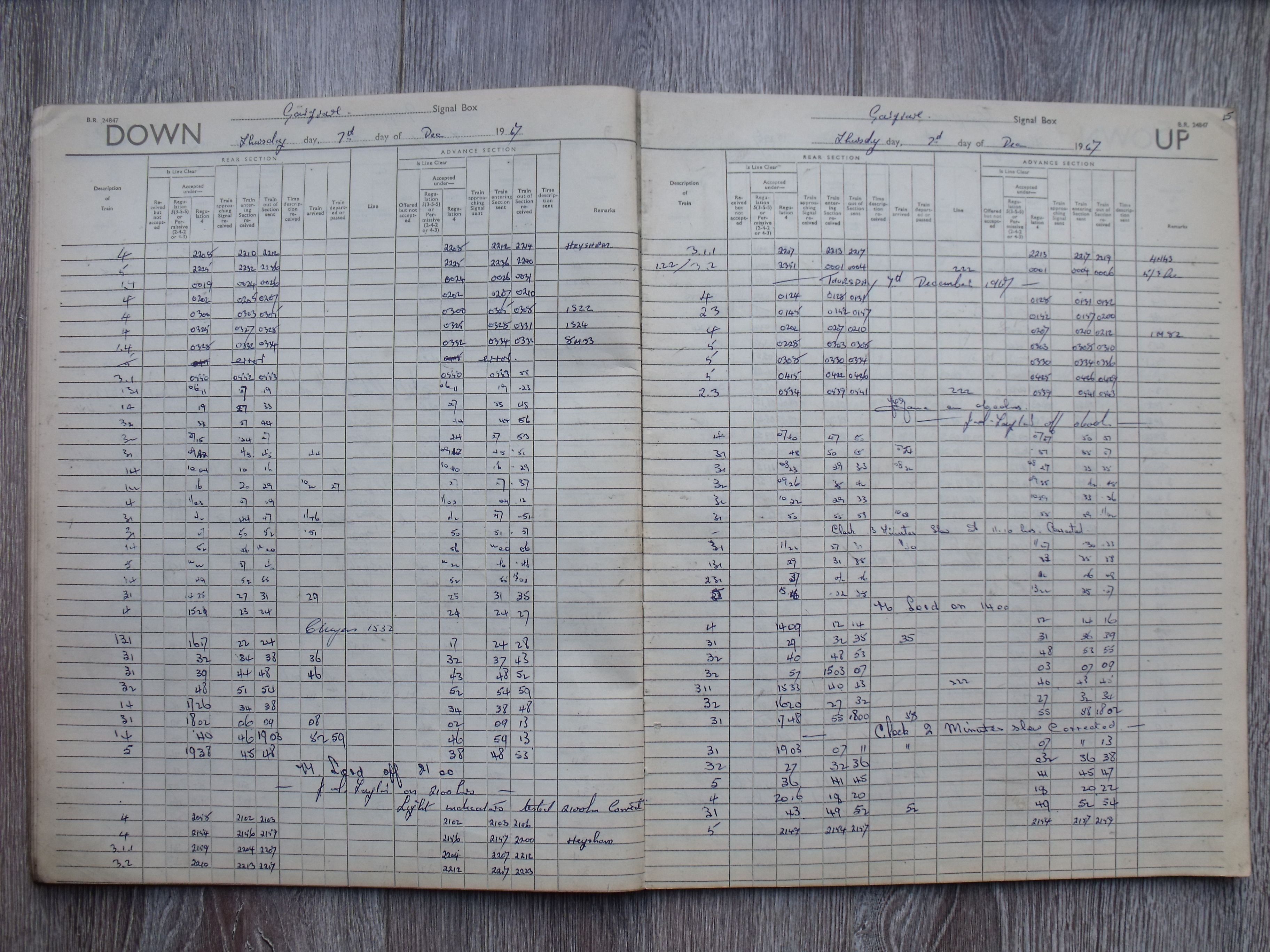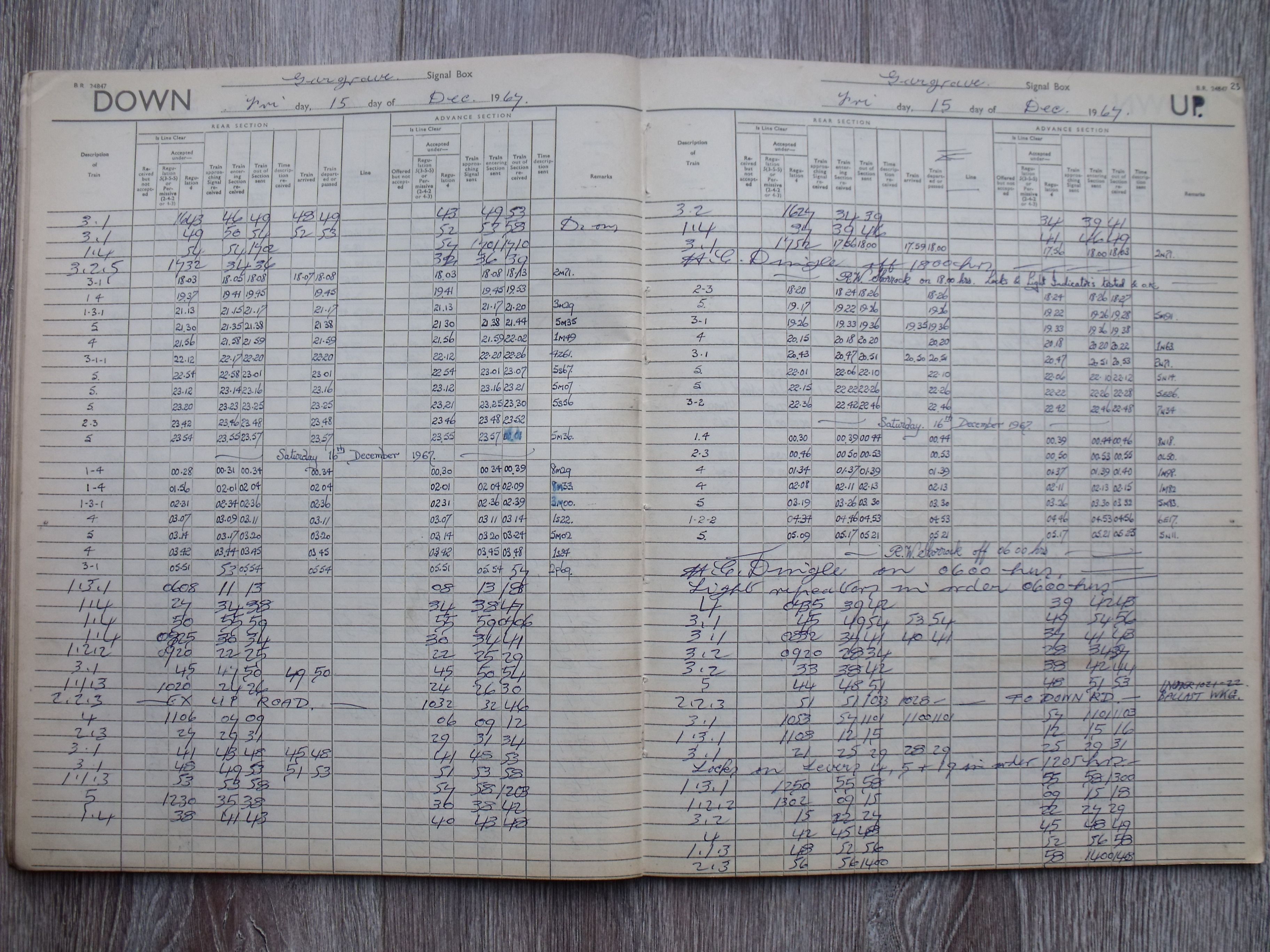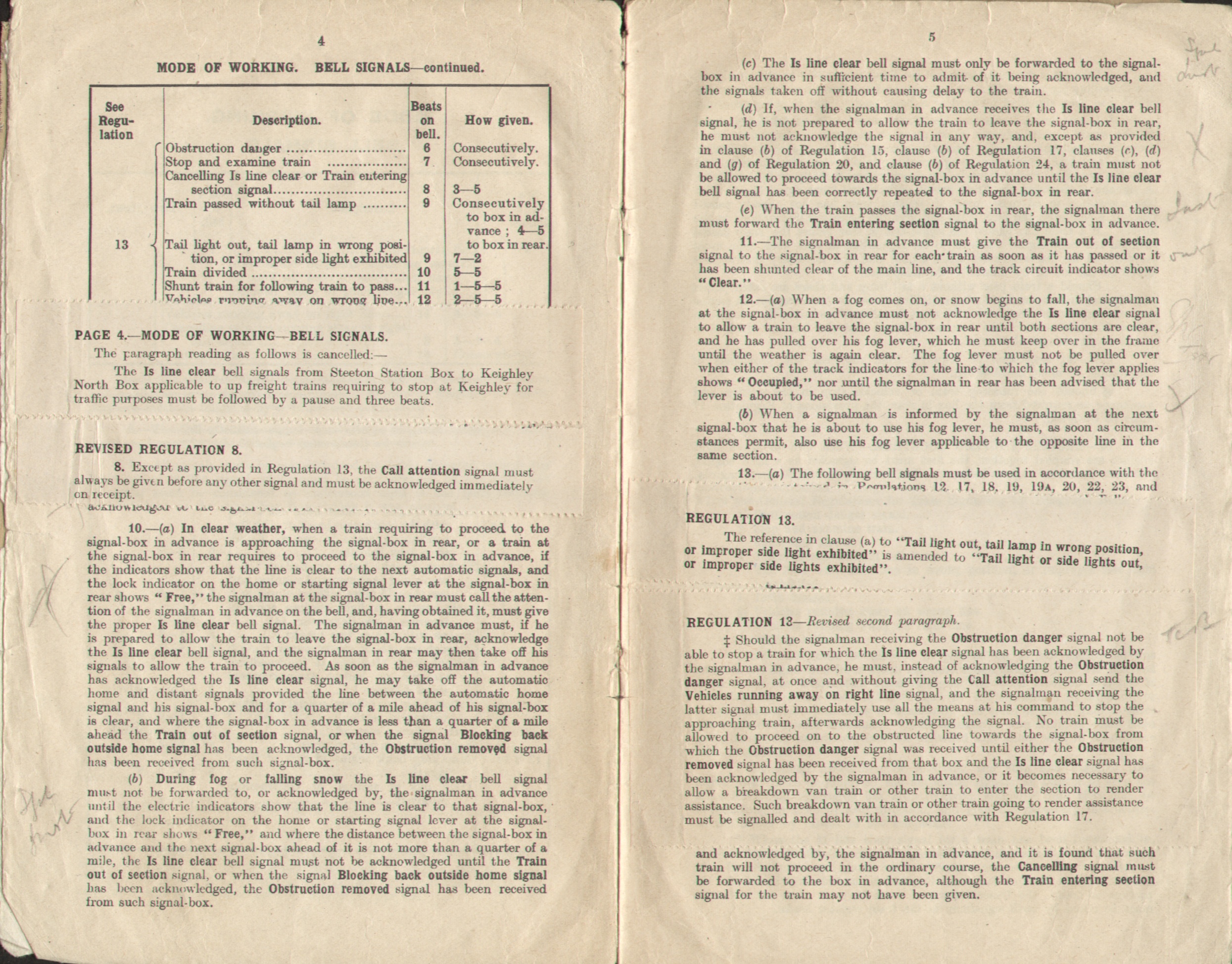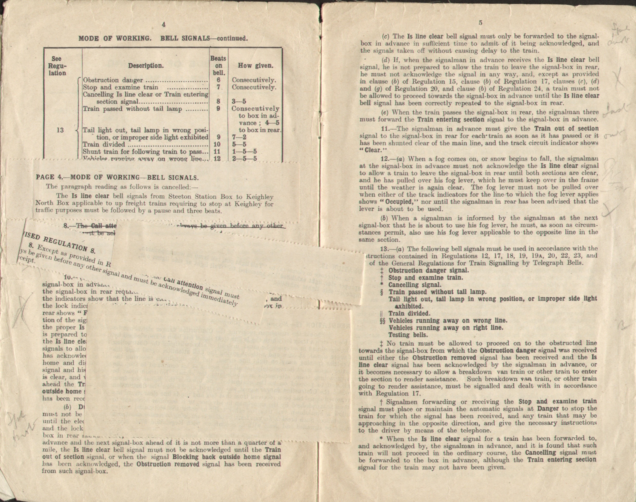 The LMS installed an early form of automatic signalling between Hellifield South Junction and Gargrave, and between Steeton and Keighley North. Shown here are a set of regulations for these sections of line, dated 1929 (was this the date of installation?), and also part of a train register from Gargrave. Although the signals were automatic, it seems to have been a requirement to maintain them at danger between trains. This led to an accident at Hellifield in 1955, when an automatic signal cleared reading into a manually controlled section for which the signal had not been replaced - the accident report can be found on the Railways Archive site here here. The report placed the blame squarely on the signalman for not replacing the signals as per the rules, but from a modern perspective the requirement for the signalman to actively do something to maintain safety seems a design flaw. As explained in the report, the signal controls were modified immediately after the accident.document with amendments title page page 1 pages 2-3 pages 4-5 pages 6-7 pages 8-9 page 10 bell signals 1950 orignal document page 1 (a) pages 1 (b) pages 2-3 pages 4-5 pages 4-5 pages 6-7 pages 8-9 (a) page 8-9 (b) Part of a Gargrave Train Register from 1967. Look carefully and you can see examples of down trains being offered and accepted before train out of section has been received for the previous train (e.g. image 13, 12:00 hrs). image 1 image 2 image 3 image 4 image 5 image 6 image 7 image 8 image 9 image 10 image 11 image 12 image 13 image 14 image 15 image 16 image 17 image 18 image 19 image 20 image 21 image 22 image 23 image 24 image 25 image 26 image 27