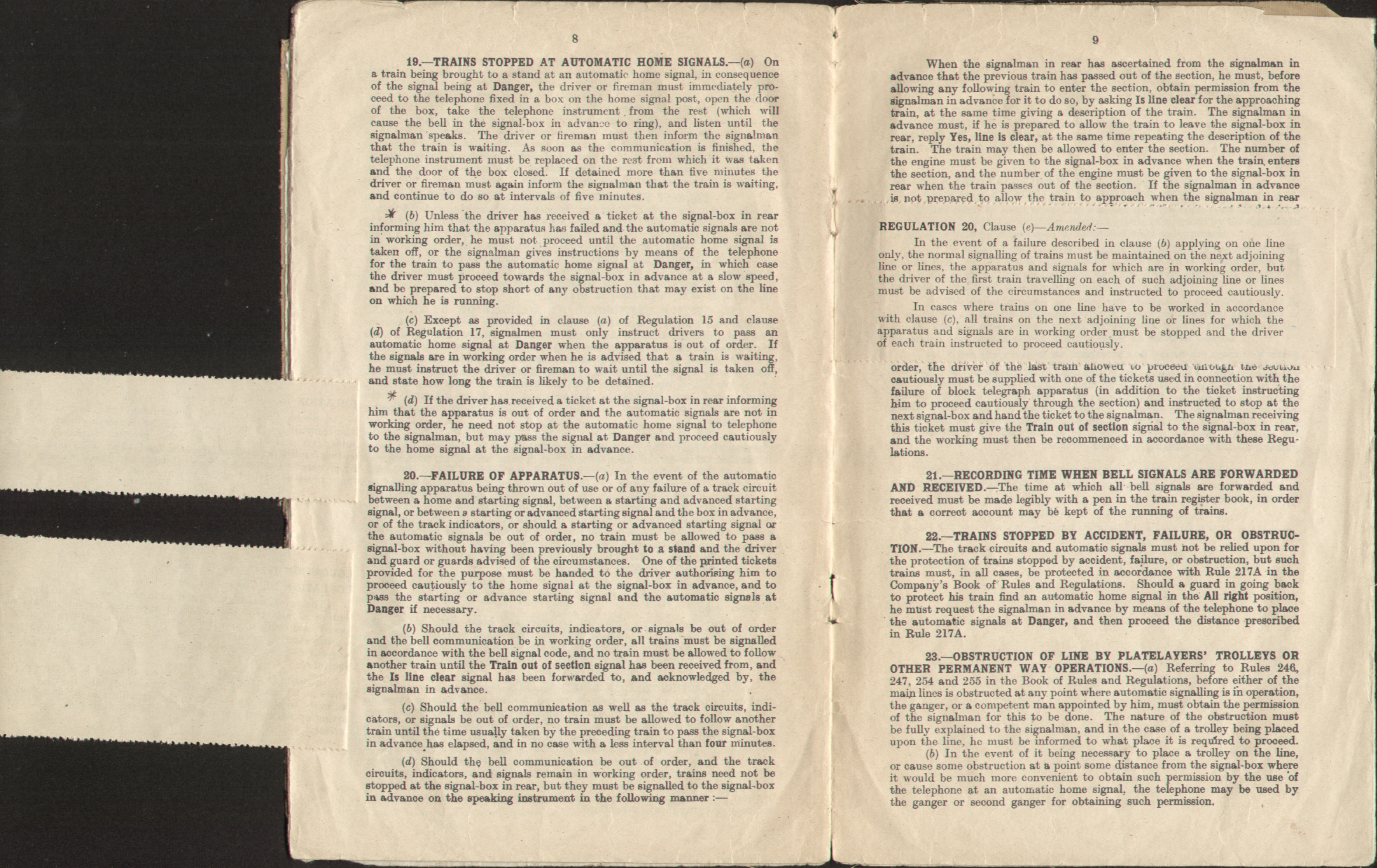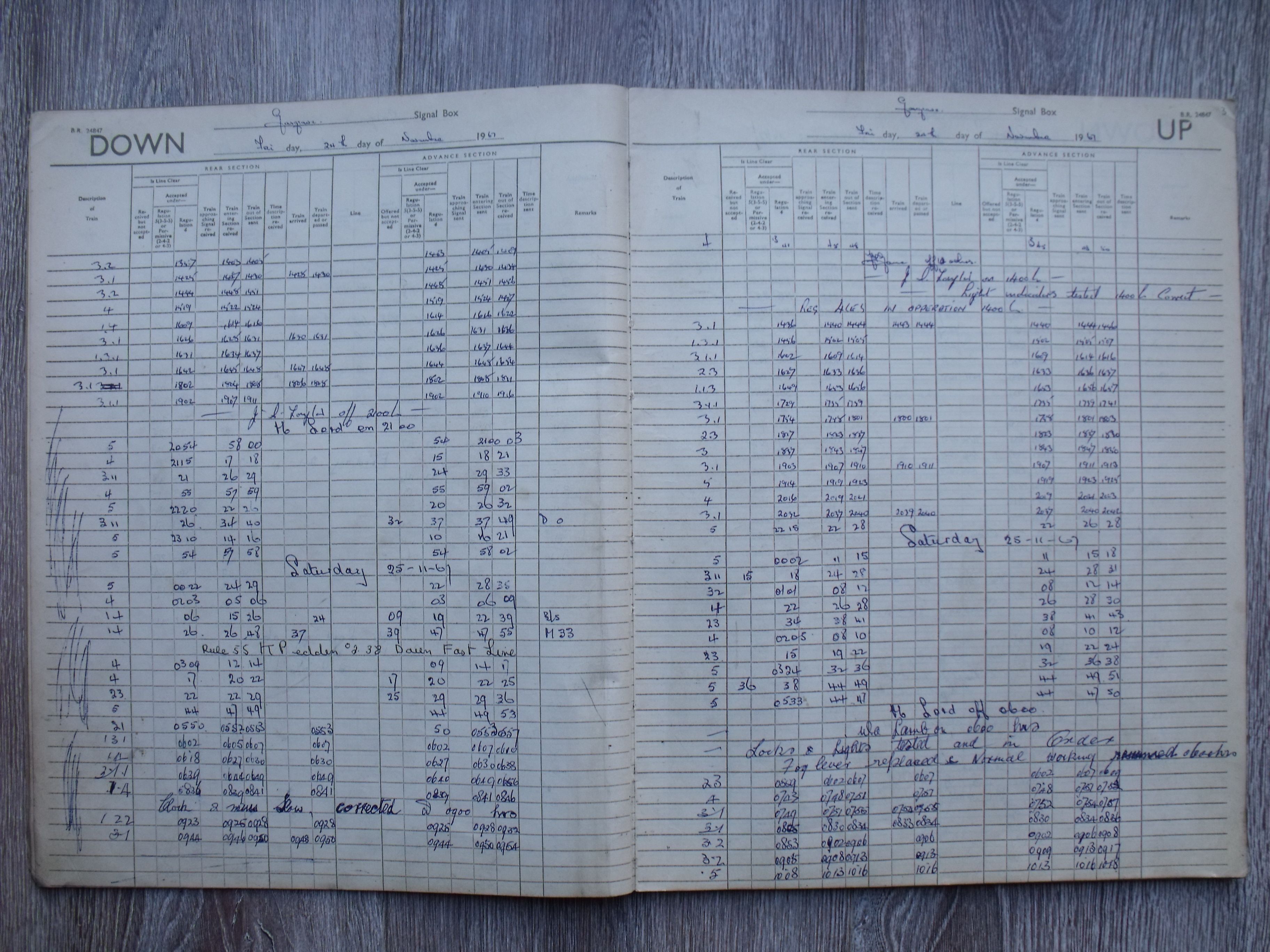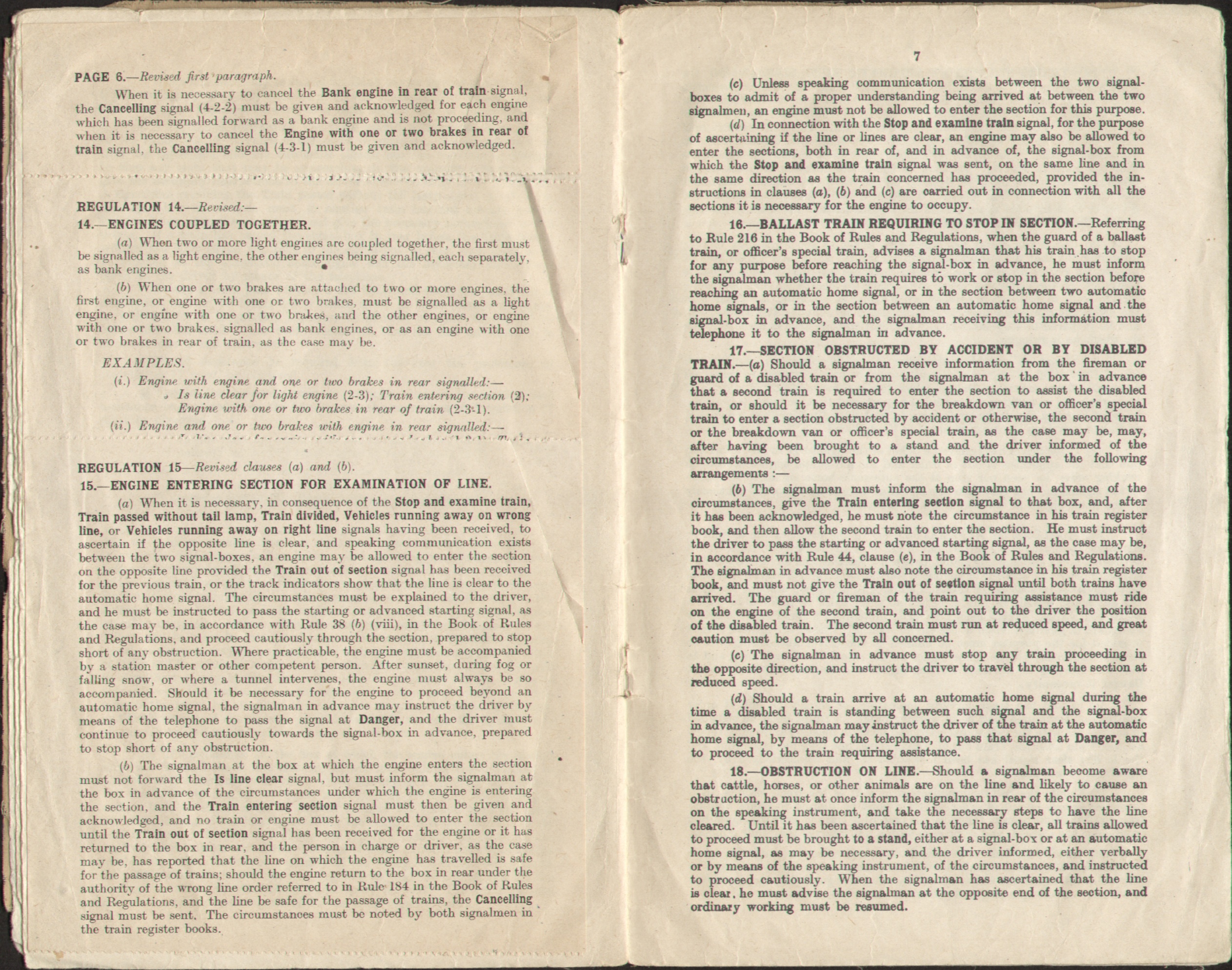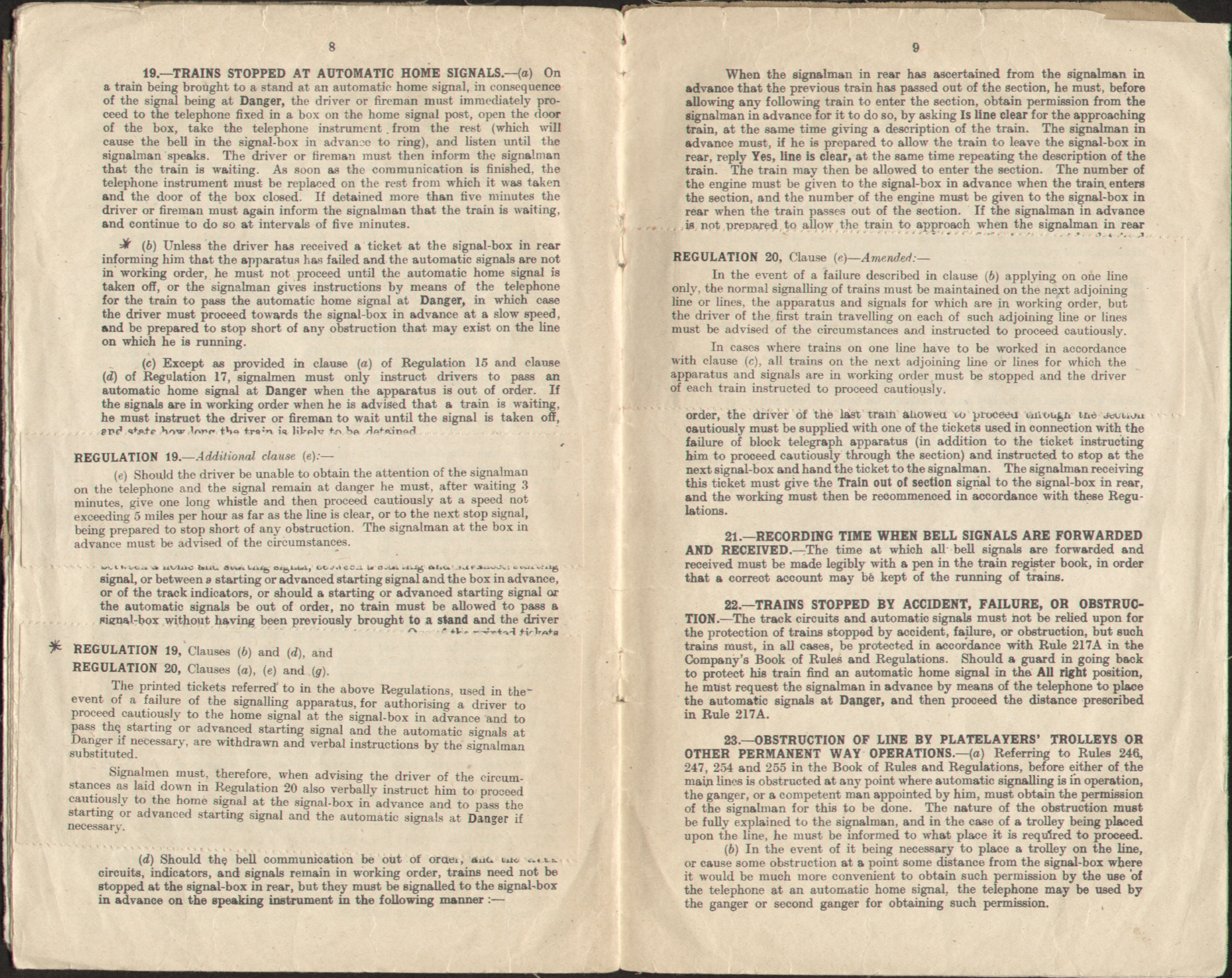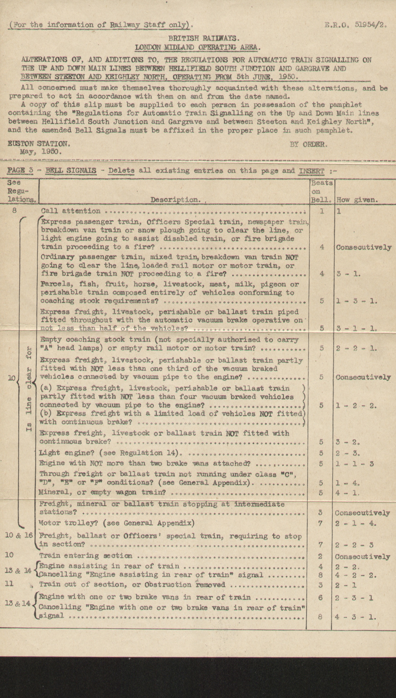 The LMS installed an early form of automatic signalling between Hellifield South Junction and Gargrave, and between Steeton and Keighley North. Shown here are a set of regulations for these sections of line, dated 1929 (was this the date of installation?), and also part of a train register from Gargrave. Although the signals were automatic, it seems to have been a requirement to maintain them at danger between trains. This led to an accident at Hellifield in 1955, when an automatic signal cleared reading into a manually controlled section for which the signal had not been replaced - the accident report can be found on the Railways Archive site here here. The report placed the blame squarely on the signalman for not replacing the signals as per the rules, but from a modern perspective the requirement for the signalman to actively do something to maintain safety seems a design flaw. As explained in the report, the signal controls were modified immediately after the accident.document with amendments title page page 1 pages 2-3 pages 4-5 pages 6-7 pages 8-9 page 10 bell signals 1950 orignal document page 1 (a) pages 1 (b) pages 2-3 pages 4-5 pages 4-5 pages 6-7 pages 8-9 (a) page 8-9 (b) Part of a Gargrave Train Register from 1967. Look carefully and you can see examples of down trains being offered and accepted before train out of section has been received for the previous train (e.g. image 13, 12:00 hrs). image 1 image 2 image 3 image 4 image 5 image 6 image 7 image 8 image 9 image 10 image 11 image 12 image 13 image 14 image 15 image 16 image 17 image 18 image 19 image 20 image 21 image 22 image 23 image 24 image 25 image 26 image 27