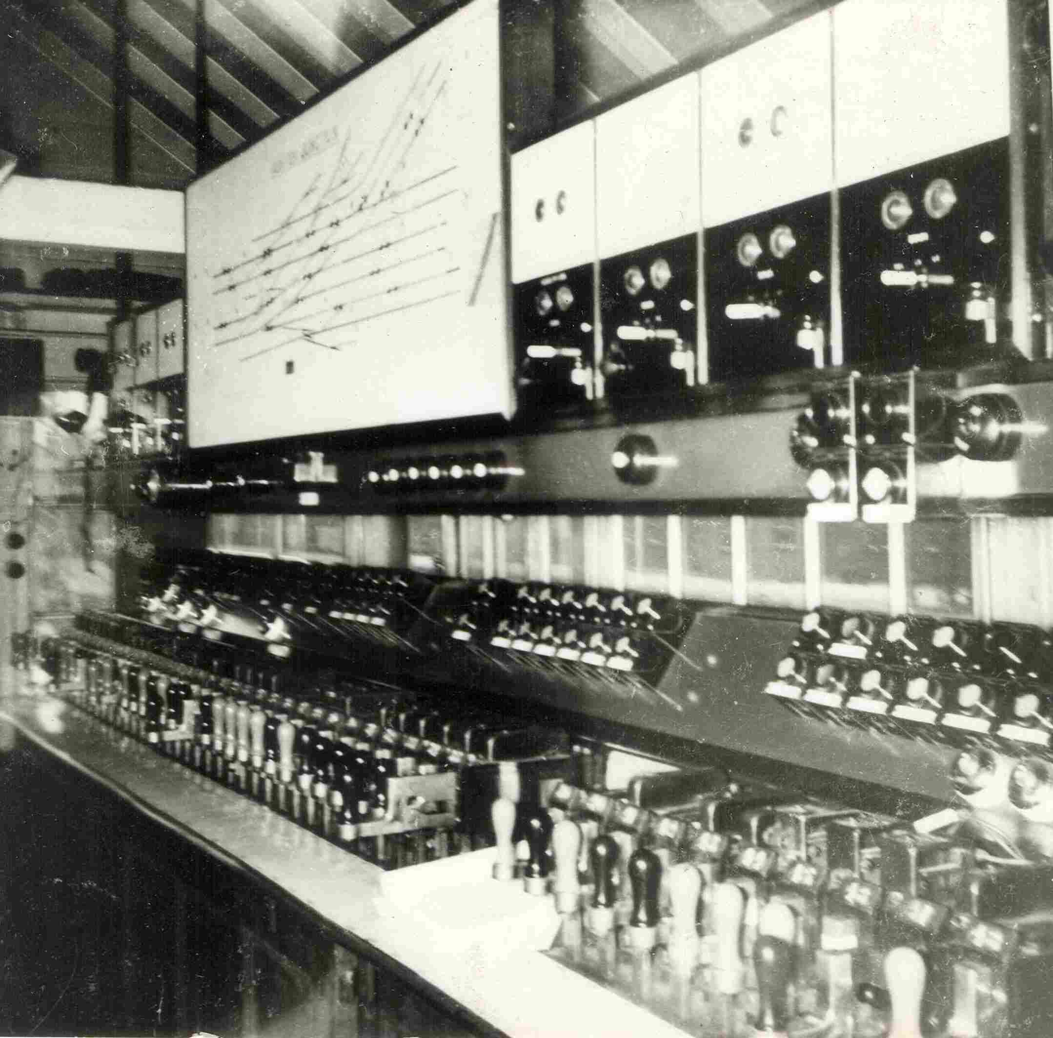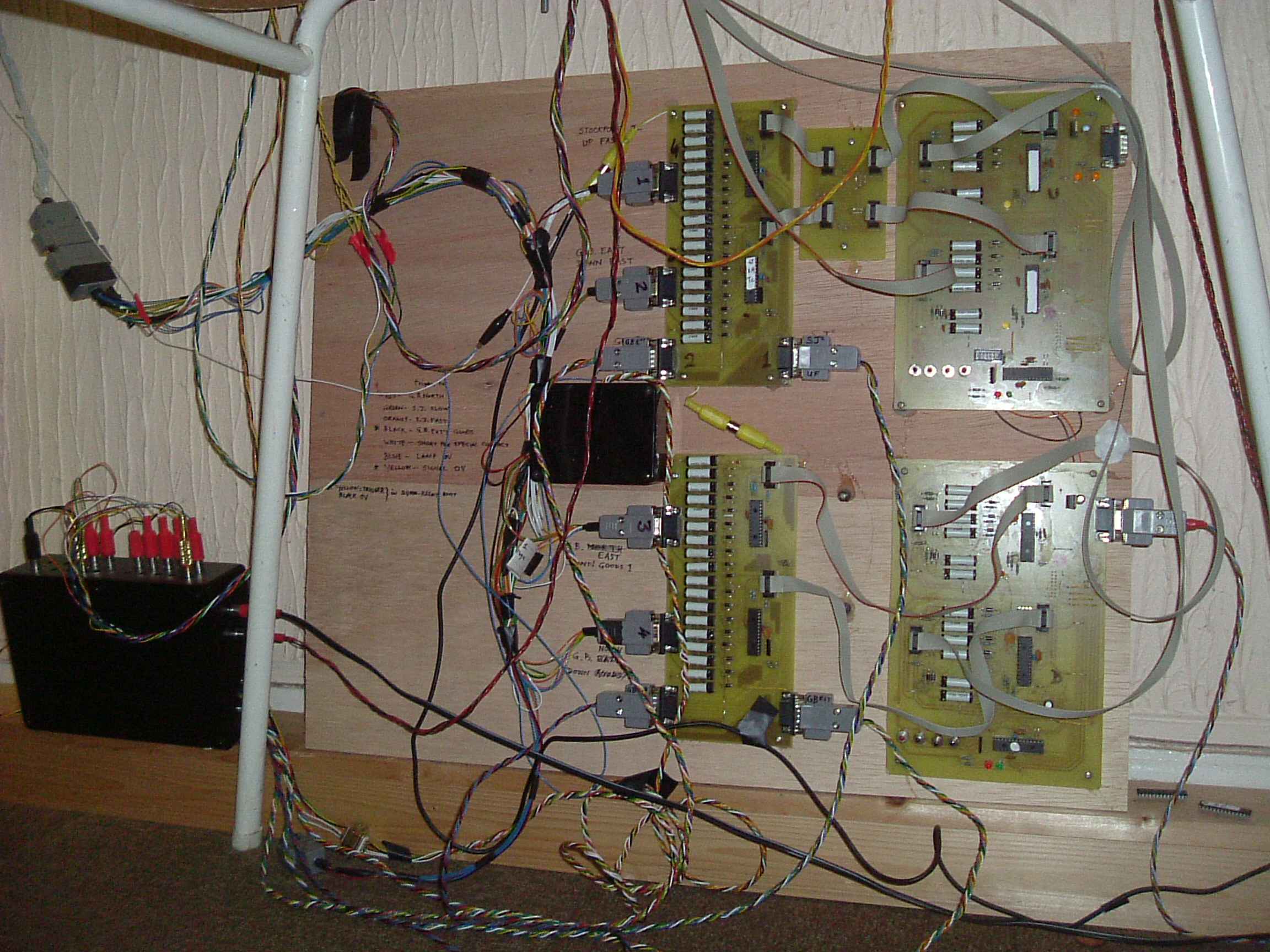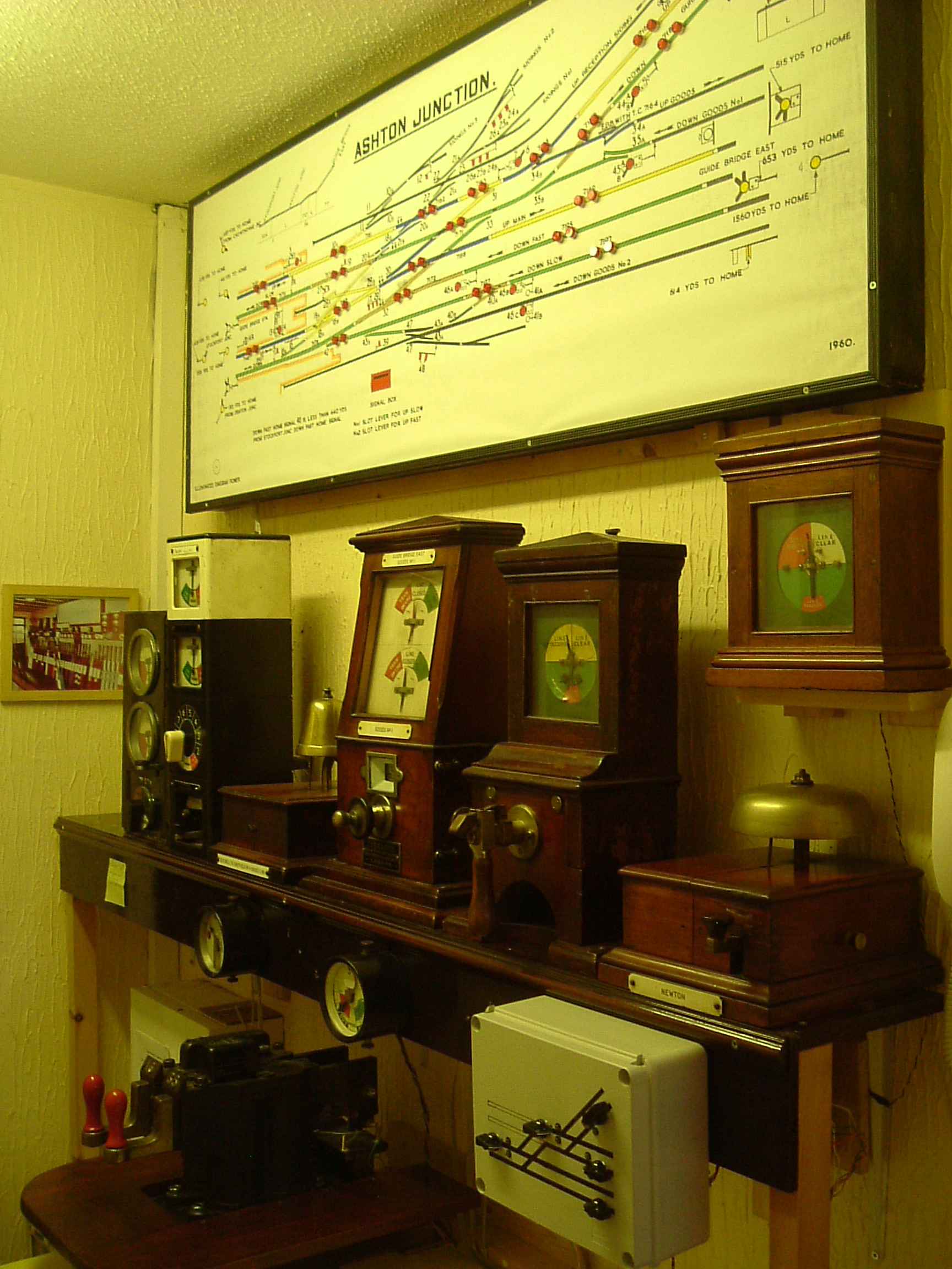 The most complicated simulation I've built so far is simplified version of Ashton Junction, which was at Guide Bridge on the former GCR main line between Sheffield and Manchester. The prototype Ashton Junction was opened in 1909 as part of the GCR's resignalling between Newton and Ardwick. These boxes were an early example of power signalling using compressed air. The pneumatic signalling was taken out of use in 1985, when the area was resignalled. The illuminated diagram is a full size replica, prepared using a copy of the original diagram. I have used an assortment of GCR / LNER / BR block instruments, of the types to be found in signal boxes along the Woodhead route. I have even managed to incorporate two pneumatic draw slides to operated the home signals! I improvised a small panel to do the remainder of the route setting. At present, the simulation only includes the fast lines to Stockport Junction, the goods and main lines to Guide Bridge East, and the branch to Guide Bridge North. In effect, I have simulated a double track junction, which splits three ways going east. But this still gives an interesting layout to operate! It does not include the slow lines to Stockport Junction, nor the down slow and down goods No 2 from Guide Bridge East, nor any of the siding connections. It may be possible to add some of these at a later date. In 1983 the slow lines to Stockport Jn were taken out of use - so it could be said there is some historical justification for my configuration. The electronics which run the simulation are hidden under the table - you can see them in the picture at right! This 'rat's nest' of wiring is the old version of the electronics. The new modules are much tidier, but work in just the same way. The two boards on the right each simulate two adjacent block posts (four in total), whilst those on the left look after the illumination of the track circuit lamps. And here is a picture of the real Ashton Junction, probably taken about 1970. You can clearly see the 48 slide pneumatic frame. On the block shelf are rather unusual block instruments, which were to be found in most of the pneumatic boxes in this area. They were installed in the 1950's when the line was electrified, and the block indications are given by coloured lamps set into a panel, rather than the more usual moving needles.
