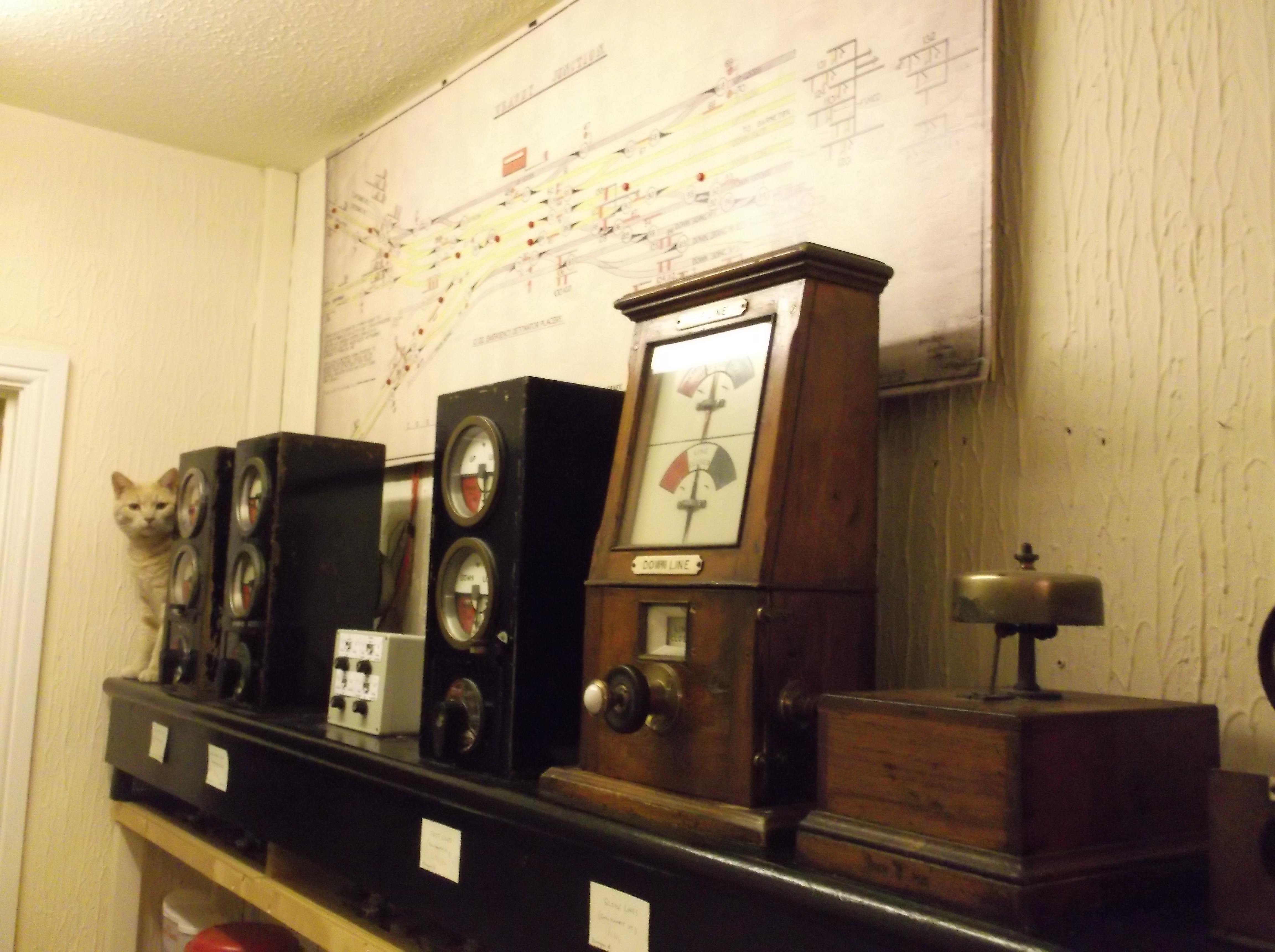 I hesitate to call this a simulation of Wrawby Junction, as readers will then expect a 137 lever frame! My aim was far more modest - to build something which would evoke trains crossing the North Lincolnshire Wolds using block instruments and bells. This is done - I think successfully! - by using four simulator modules to create a 4-track main line with interconnections. This can approximately recreate Wrawby, if we make some simplifications/deletions: the Brigg line is ignored; the sidings are ignored; and the Down Goods line is ignored. Nevertheless, that still captures most (probably >90%) of the through traffic. Therefore the lines included are up and down Yorkshire, up and down Lincoln, up and down fast to Barnetby East, up and down slow to Barnetby East. You can think of this as a work in progress - I am still making modifications to it. Adding a fifth block module (for the Down Goods) would be possible in theory, but is not very convenient electrically, and also I've no extra room, so it is not likely to happen. The diagram is a copy of the original GCR Wrawby Junction diagram - which had to be slightly reduced in size (the original is stored away carefully!). The original has only six track circuits (for the home and starting signals at the west end of the layout, to Doncaster, Retford and Lincoln). I've added red lamps to these, and also added lamps corresponding to some of the modern TCs - just (barely) enough to make the simulation workable. The signalling has been simplified to just 8 routes over the junction; the starting signals to Elsham and Holton-le-Moor are ignored at the moment. In the simulation these 8 routes were originally controlled from a what was in effect a simple OCS panel (the simulator modules have one input (=switch) per route). In this case, the routes were interlocked with each other, but not with TCs. The simulations I've built were intended to bring to life the block instruments and diagram, and don't generally have any interlocking (the 8 routes here are an exception). However, the system will - as far as possible - detect errors by the user: bell ringing errors, pegging line clear with the home signal off or irregularly sending a train into section. A score is kept of the number of errors. As regards block instruments, the simulation really ought to have four 'Tyer's black box' instruments - or possibly a BR standard block for the fast lines (as was the case at the end). For the time being, the slow lines are worked by a GCR Tyer's permissive - partly as I had one wired up and sitting on the shelf already, but mainly because I just like these instruments! The system is presently programmed using information obtained from www.realtimetrains.co.uk for 22 Dec 2015 (but with down goods traffic sent over the down slow). Entry points (i.e. for offering the trains) are assumed to be Wickenby, Appleby and Brocklesby. As far as I know this is correct - and is the basis for my saying the setup evokes trains crossing the Lincolnshire Wolds. As far as I understand, in reality routing of trains was obtained from TRUST, or freights were described by circuit call when approaching Ulceby. The down fast and slow modules here have been modified to provide routing information 3 minutes before the train is offered - albeit in a very simple way: a white LED (for the White Rose county) or a yellow LED (for Yellow Belly county). Finally - for now! - the simple OCS panel described earlier was useable, but effectively ignored a critical and interesting feature of the layout. In the down direction, the junction points were within the clearing points. Thus the junction had to be set appropriately before line clear could be given. This feature, of course, cannot be replicated on a route setting system. Possibly I ought to use an IFS type interface, with switches corresponding to the appropriate levers. For now, though, I've opted for a simpler 'solution' to this 'problem' using a method which I think is logical enough, but never existed anywhere in reality. It works like this: The OCS panel was retained, but merely illuminates a white route light when the route has been set (which would be equivalent to points set and locked in reality), but does not clear the signal. Having got the white light (which in the down direction is equivalent to clearing point available - I think) you give line clear, with the signal still on. A separate switch clears the signal later on. The system will award penalty points if line clear is given with the signal off, or with no clearing point...