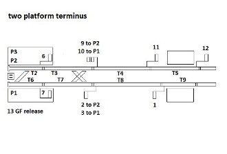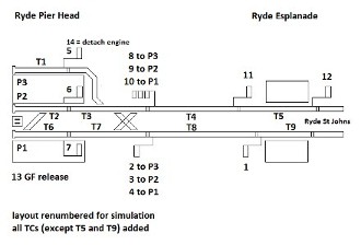 As explained elsewhere, one module on its own will simulate a terminus. Thus it makes an interesting challenge to find an interesting location which will fit on just one chip. Ryde Pier Head appears to be one such location. A little liberty was taken with the layout shown shown here, in that I added most of the track circuits (or else you've no idea where the trains are!). Special code was written for the TC chip, to allow the running of engines around (or between) trains. To do this, switch 13 acts as ground frame release (although there's no readback to show if the GF is normal or not: the switch is operated as soon as a train occupies - for example - T2 and replaced as soon as an engine appears on T6). The three platform layout with run rounds shown here is the very limit of what can be fitted on the TC chip. In reality, Ryde Pier Head had 3 platforms until the 4th was added in the 1930's. Shortly after developing this simulation, I obtained an Isle of Wight Working Timetable (shown elsewhere on this web site) from 1936, when RPH had 4 platforms. On a busy summer Saturday in the middle of the day, there were 6 departures and 6 arrivals per hour. This section of the timetable was duly programmed onto the timetable chip. My WTT doesn't give platform information, but it turns it can be operated with just 3 platforms - provided one follows the rule that Ventnor stopping trains use platform 1, Cowes trains platform 2 and other Ventnor trains platform 3. This makes an entertaining little simulation - but one with no room for error! A few simplifications were necessary to make the layout fit on the chip. For example, a train cannot be longer than T3 or T7 (i.e. you can't have three TC lamps illuminated at once). General 2 platform terminus: As part of developing Ryde Pier Head, I also generated this slightly simpler terminus. In this case, trains can be longer than T3 or T7. Notes added 21/5/2016: I don't know the actual bell codes used at Ryde Pier Head, but this simulation is programmed with 4 = Ventnor non stopping; 3-1 = Ventnor stopping; 1-3 = Cowes. The simulator features the following bell signals: Is Line Clear, Train Entering Section, Train out of section (without call attention, in this case). (It also allows train approaching, banking engines, permissive working, and blocking back (2-4, 3-3 or 3-3-4), but these do not feature in the Ryde Pier Head simulation. Opening and closing of signal box, wrong direction working, and the emergency signals, are not catered for). This simulation uses 16 signal inputs; these are 'diode multiplexed', i.e. it requires a box with 16 switches, with diodes soldered to them (circuit diagram is given in the manual - see further information page).
