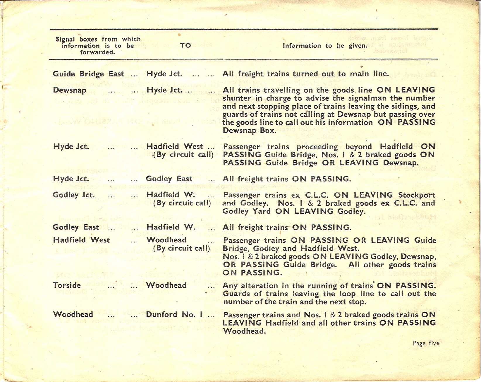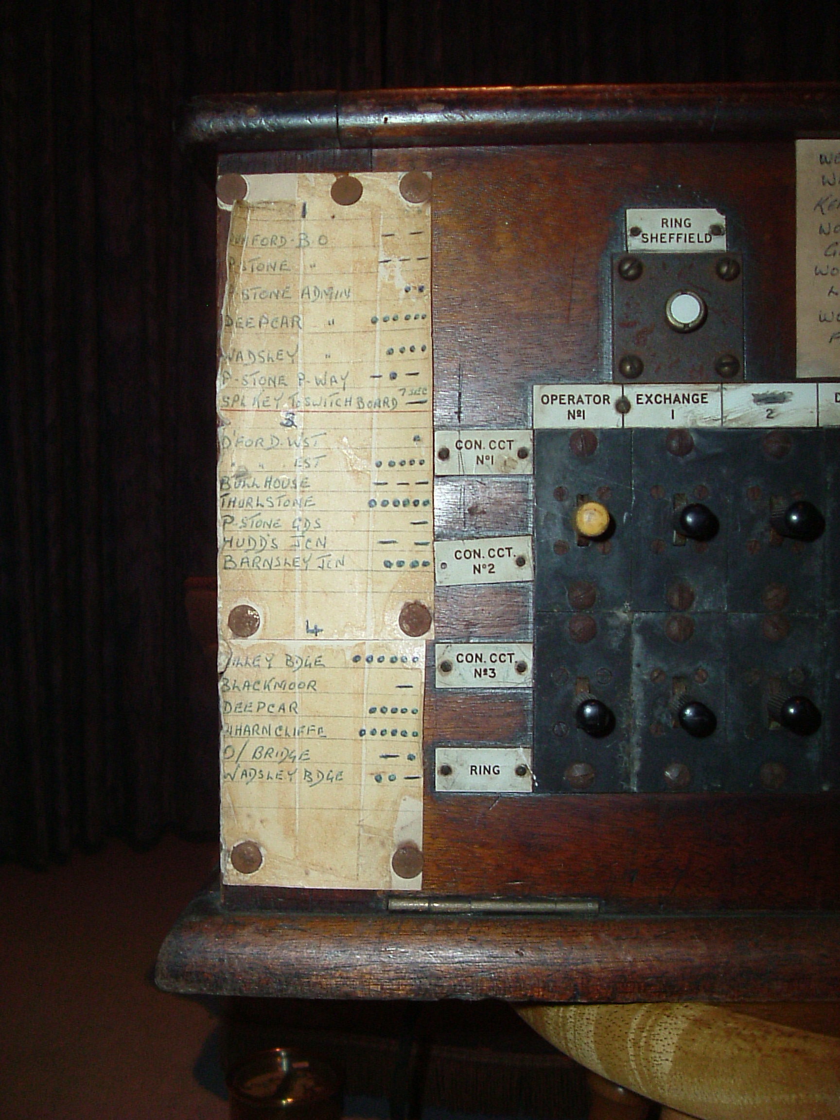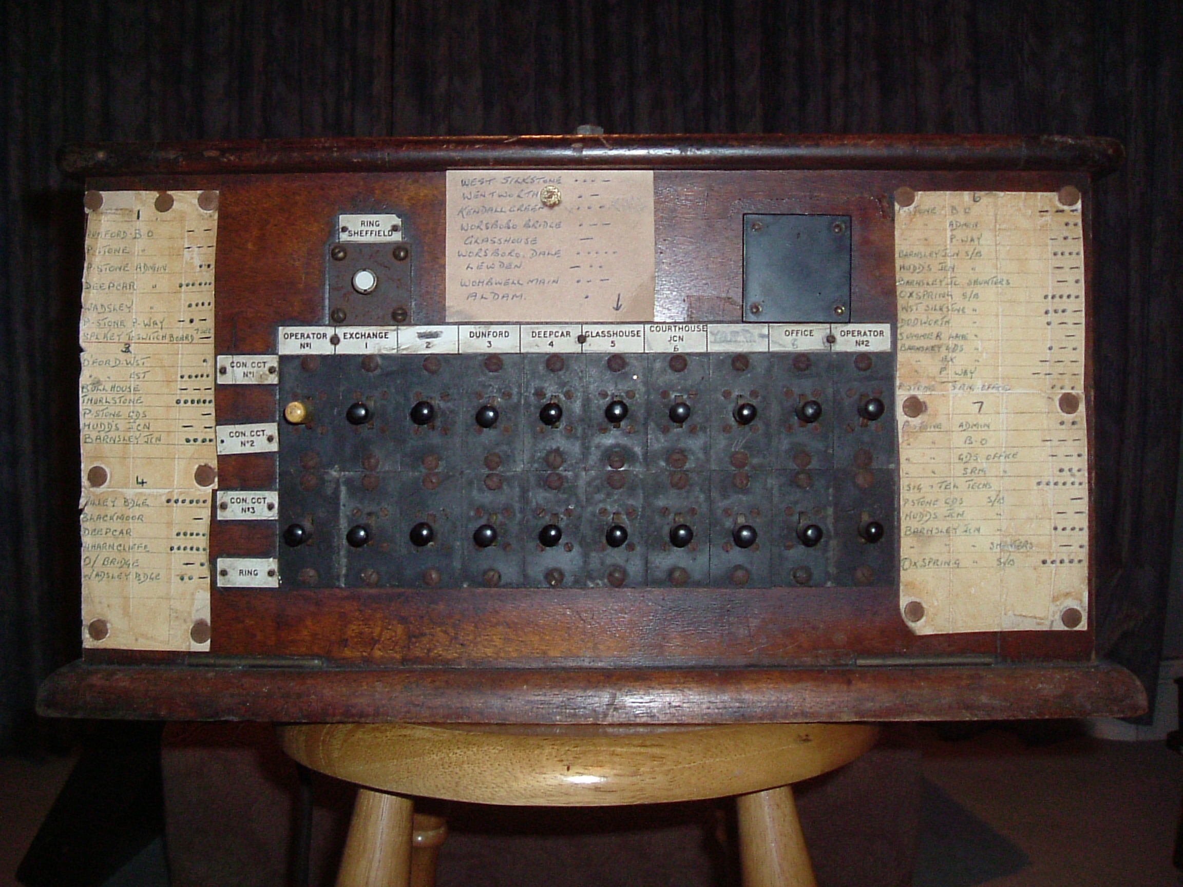A number of signal box diagrams from the Woodhead line may be found on my signal box diagram pages. This page contains various other Woodhead-related items. Train reporting via telephone between signal boxes on the Manchester-Sheffield main line. An LNER document dated 1948. Title page, page 1, page 2, page 3, page 4, page 5, page 6, page 7, page 8, page 9, page 10, page 11, page 12, page 13, page 14, page 15, page 16. Telephone circuits between signal boxes in 1900 Extracts from sections 1 and 4 of the 1900 GCR working timetable. page 1, page 2, page 3, page 4. You will note that these pages also list train telegraph circuits as well as telephone circuits - indeed some routes only had the telegraph, whilst others had both telegraph and telephone. The first document on this page indicates that telephone reporting was the preferred way of doing things in LNER days. Even so, I am informed by a friend - who remembers railway staff who worked on the line - that the telegraph was used on the Wigan-Glazebrook line into BR days. Still on the subject of telephones, here is an old telephone exchange from the Penistone area which I recently obtained. It is probably out of a signal box - but which one? There are close-ups of the left, centre and right so that you can read the dot-dash codes used to identify particular signal boxes on each circuit. I don't know when it was installed, although it probably came out of use when the Woodhead route closed. It is curious that the trafolite plates refer to locations at the ends of telephone circuits from Penistone - Deepcar, Glasshouse, Courthouse Junction - as indicated in the GCR 1900 WTT, whilst the (more recent?) paper labels refer to locations further afield. Were the telephone circuits reorganised after the installation of this unit with its trafolite plates?