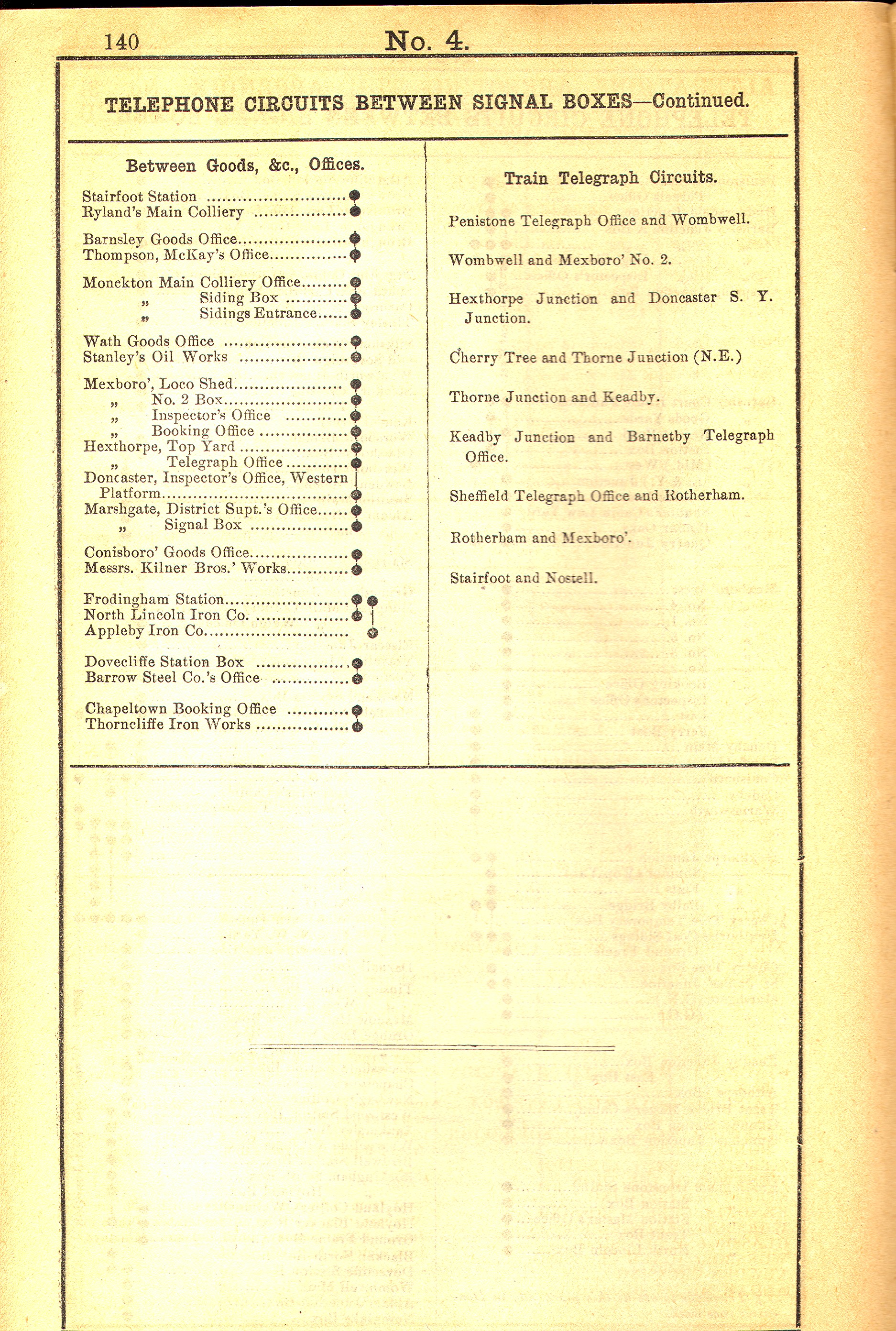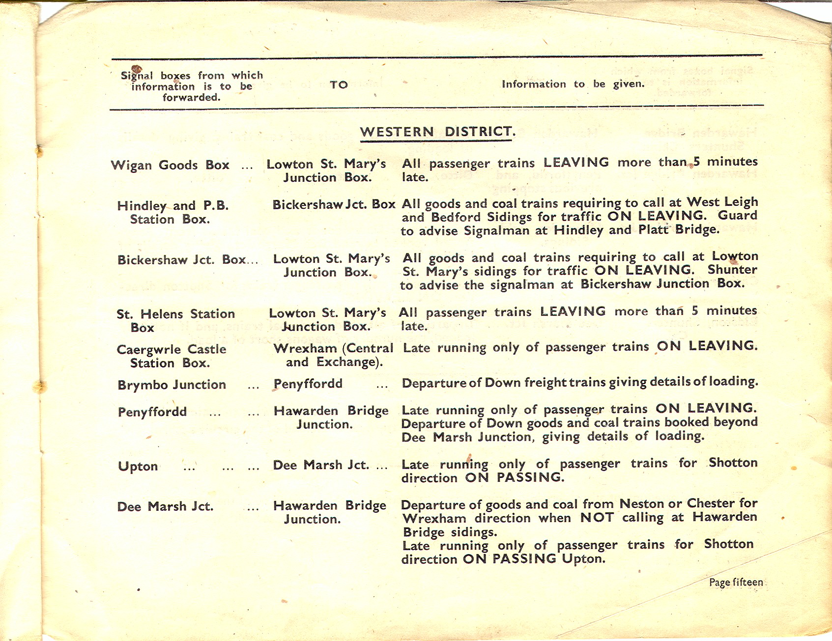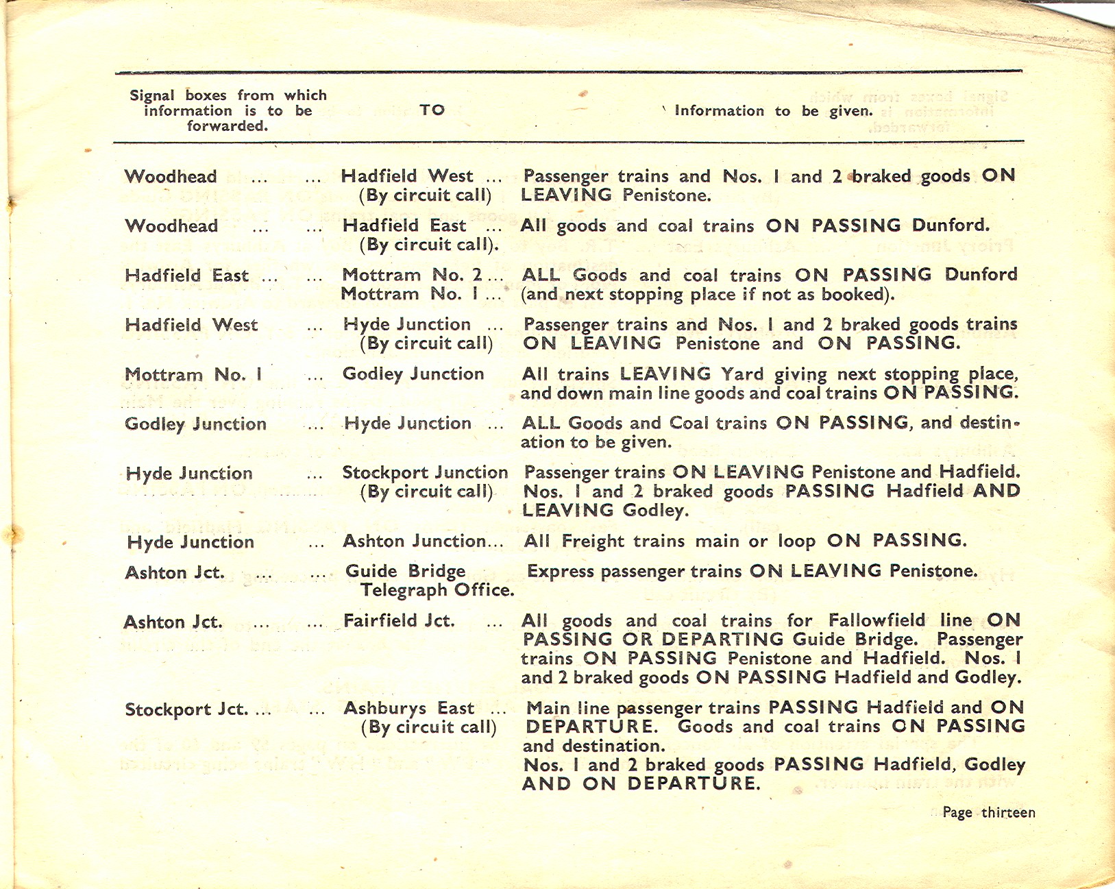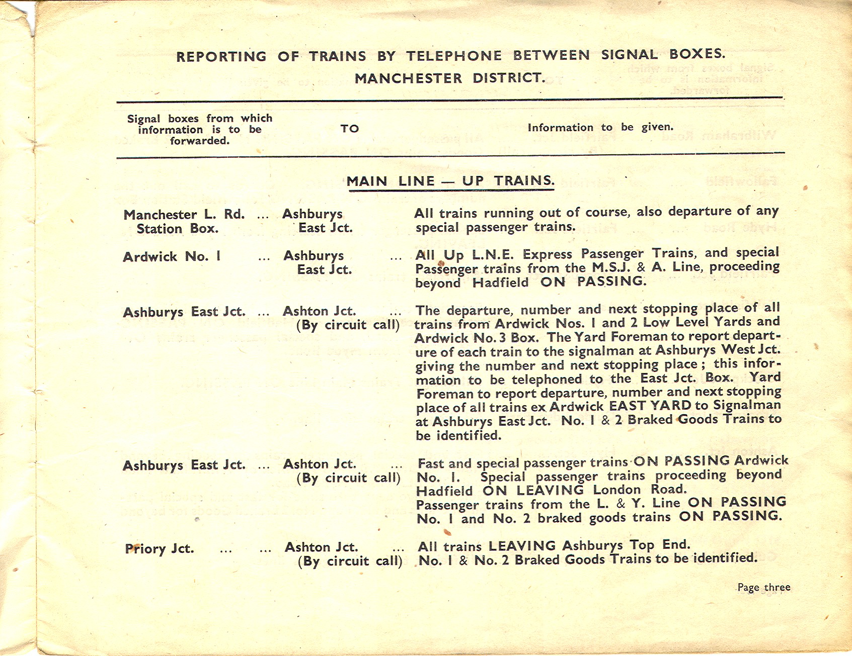 A number of signal box diagrams from the Woodhead line may be found on my signal box diagram pages. This page contains various other Woodhead-related items. Train reporting via telephone between signal boxes on the Manchester-Sheffield main line. An LNER document dated 1948. Title page, page 1, page 2, page 3, page 4, page 5, page 6, page 7, page 8, page 9, page 10, page 11, page 12, page 13, page 14, page 15, page 16. Telephone circuits between signal boxes in 1900 Extracts from sections 1 and 4 of the 1900 GCR working timetable. page 1, page 2, page 3, page 4. You will note that these pages also list train telegraph circuits as well as telephone circuits - indeed some routes only had the telegraph, whilst others had both telegraph and telephone. The first document on this page indicates that telephone reporting was the preferred way of doing things in LNER days. Even so, I am informed by a friend - who remembers railway staff who worked on the line - that the telegraph was used on the Wigan-Glazebrook line into BR days. Still on the subject of telephones, here is an old telephone exchange from the Penistone area which I recently obtained. It is probably out of a signal box - but which one? There are close-ups of the left, centre and right so that you can read the dot-dash codes used to identify particular signal boxes on each circuit. I don't know when it was installed, although it probably came out of use when the Woodhead route closed. It is curious that the trafolite plates refer to locations at the ends of telephone circuits from Penistone - Deepcar, Glasshouse, Courthouse Junction - as indicated in the GCR 1900 WTT, whilst the (more recent?) paper labels refer to locations further afield. Were the telephone circuits reorganised after the installation of this unit with its trafolite plates?